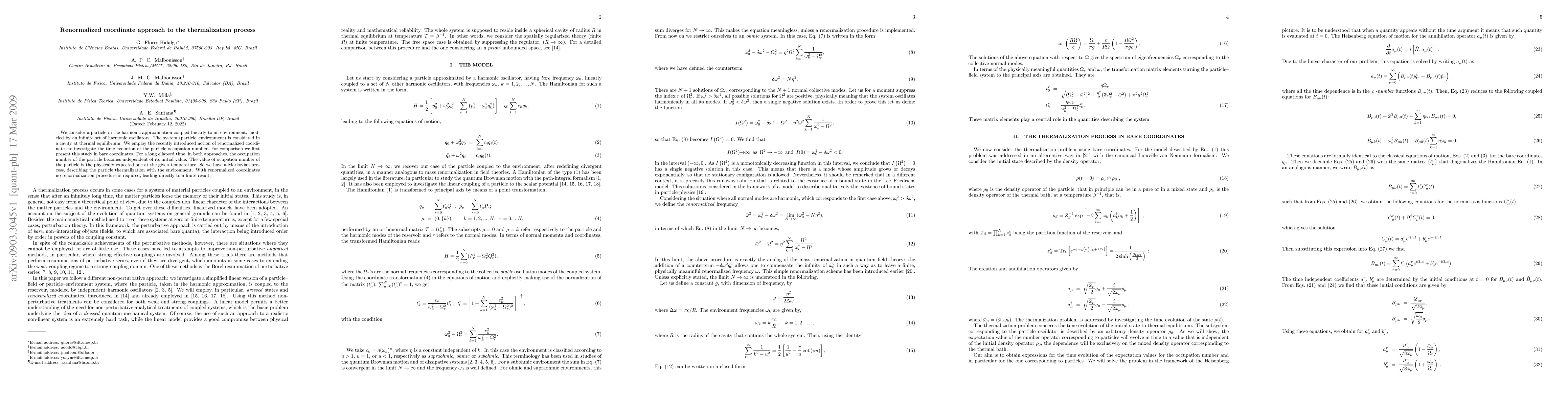 We consider a particle in the harmonic approximation coupled linearly to an environment. modeled by an infinite set of harmonic oscillators. The system (particle--environment) is considered in a cavity at thermal equilibrium. We employ the recently introduced notion of renormalized coordinates to investigate the time evolution of the particle occupation number. For comparison we first present this study in bare coordinates. For a long ellapsed time, in both approaches, the occupation number of the particle becomes independent of its initial value. The value of ocupation number of the particle is the physically expected one at the given temperature. So we have a Markovian process, describing the particle thermalization with the environment. With renormalized coordinates no renormalization procedure is required, leading directly to a finite result.
