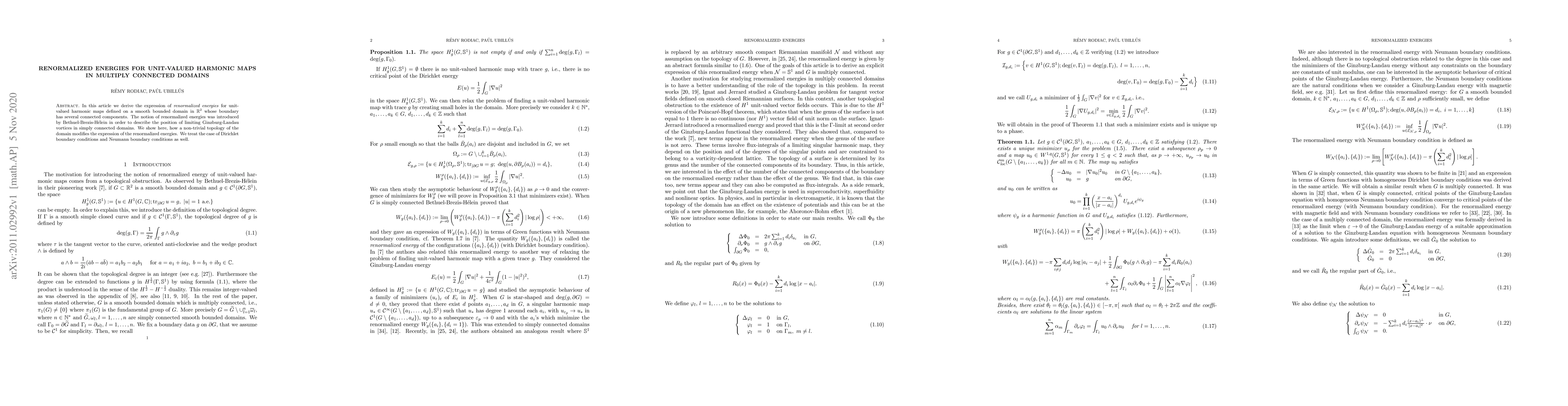 Researchers derived a new expression for renormalized energies of unit-valued harmonic maps in multiply connected domains, accounting for the domain's topology and boundary conditions.
