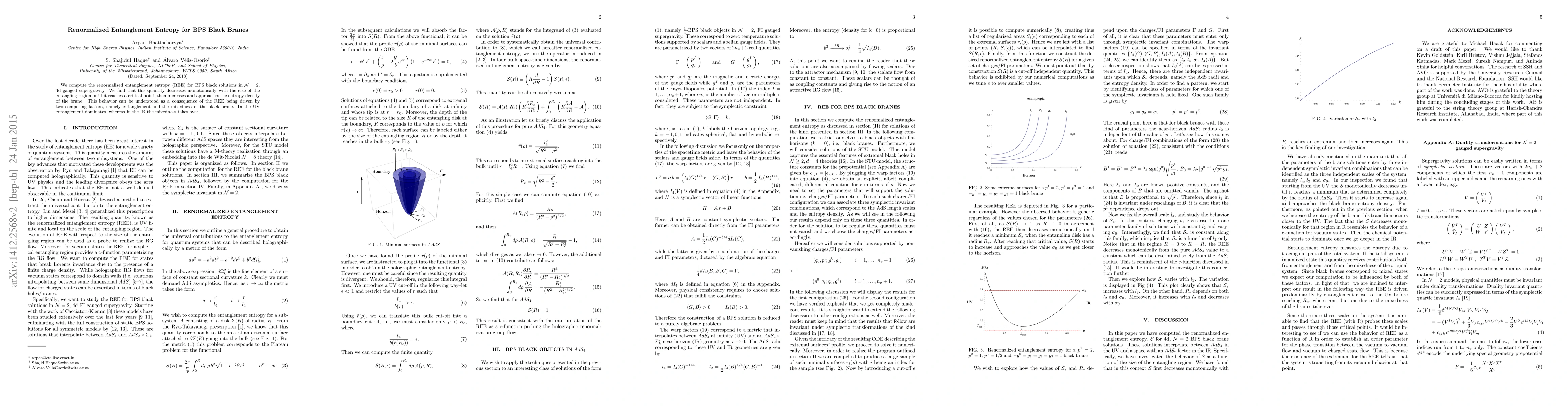 The paper computes the renormalized entanglement entropy (REE) for BPS black branes in ${\cal N}=2$, 4d gauged supergravity, finding it decreases until a critical point then increases towards the brane's entropy density, driven by entanglement and mixedness competition.