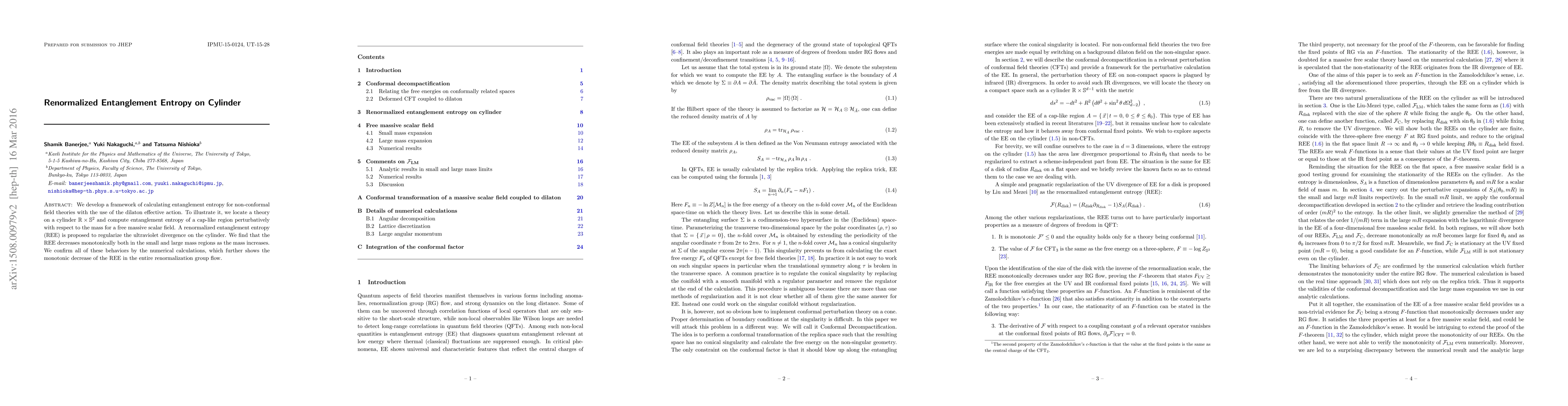 This paper develops a framework for calculating entanglement entropy in non-conformal field theories using the dilaton effective action, focusing on a cylinder geometry. It proposes a renormalized entanglement entropy (REE) to address ultraviolet divergences and finds that the REE decreases monotonically with increasing mass, confirmed by numerical calculations.