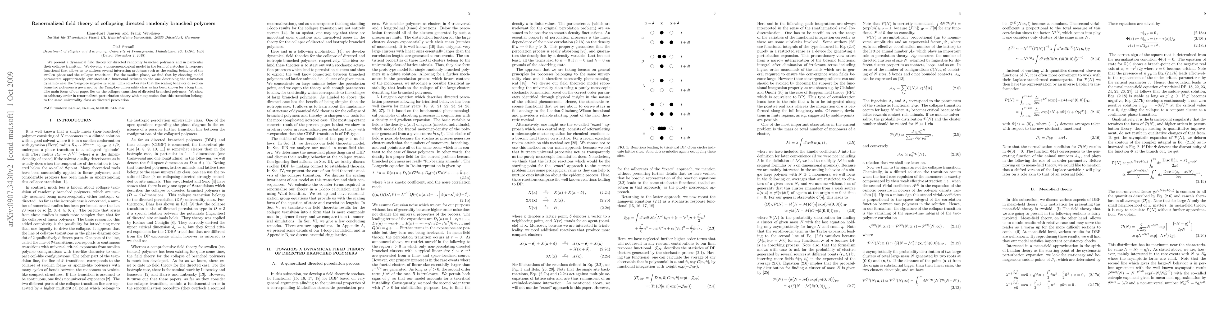This paper develops a dynamical field theory for directed randomly branched polymers, focusing on their collapse transition. It shows that the scaling behavior of the swollen phase aligns with the Yang-Lee universality class, and the collapse transition shares the same universality class as directed percolation.