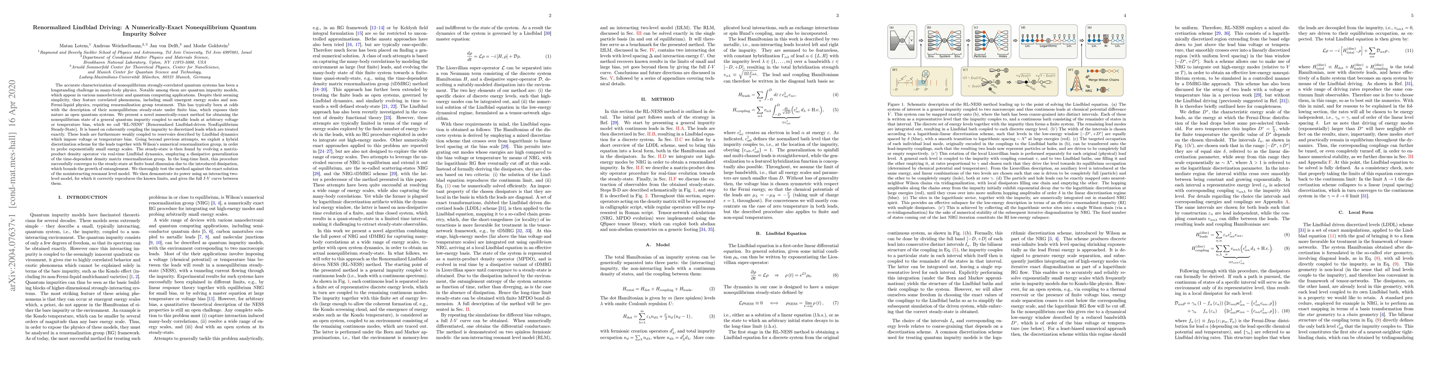 This paper introduces a numerically-exact method, RL-NESS, for solving nonequilibrium quantum impurity models, combining discretized leads with Lindblad dynamics to impose bias and employing Wilson's renormalization group for accurate results. The method is tested against the resonant level model and an interacting two-level system, showing its effectiveness.