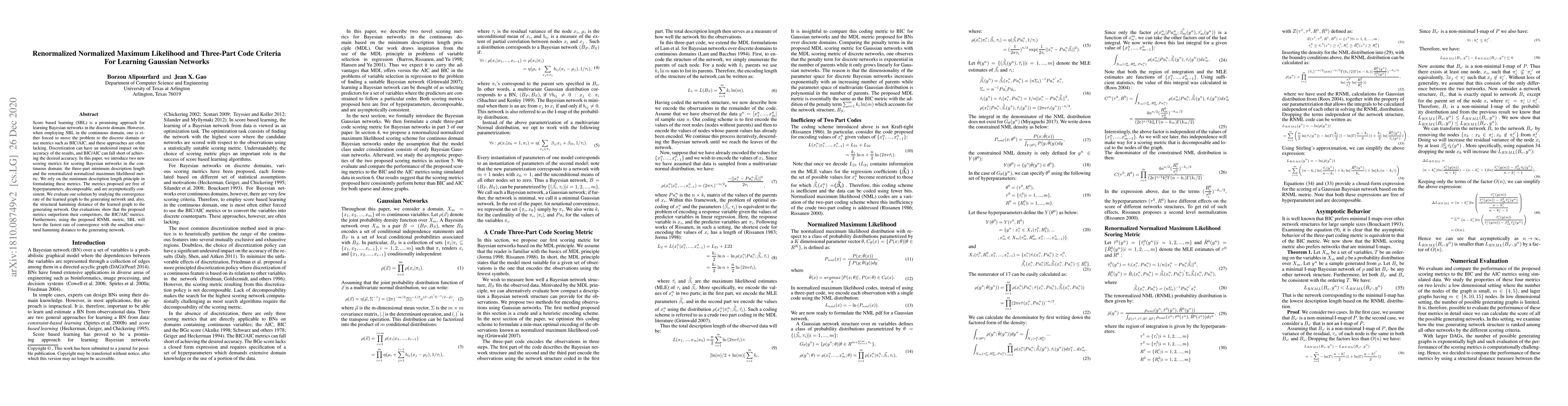 This paper introduces two new scoring metrics for learning Bayesian networks in the continuous domain, outperforming BIC/AIC metrics in terms of accuracy and convergence rate.