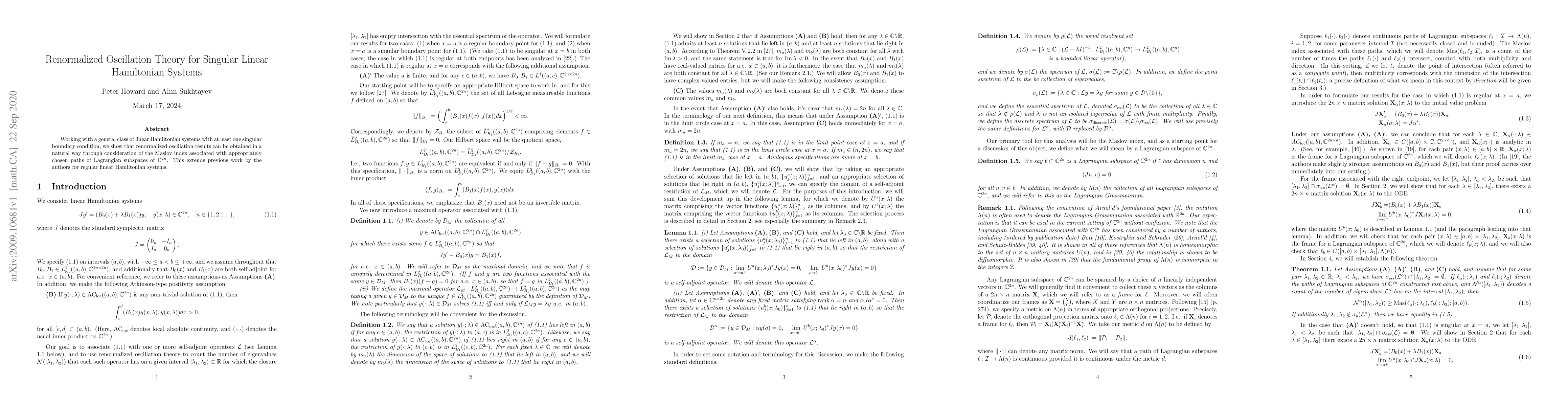 This paper extends renormalized oscillation theory to singular linear Hamiltonian systems by utilizing the Maslov index linked to Lagrangian subspaces, providing a natural extension from previous work on regular systems.