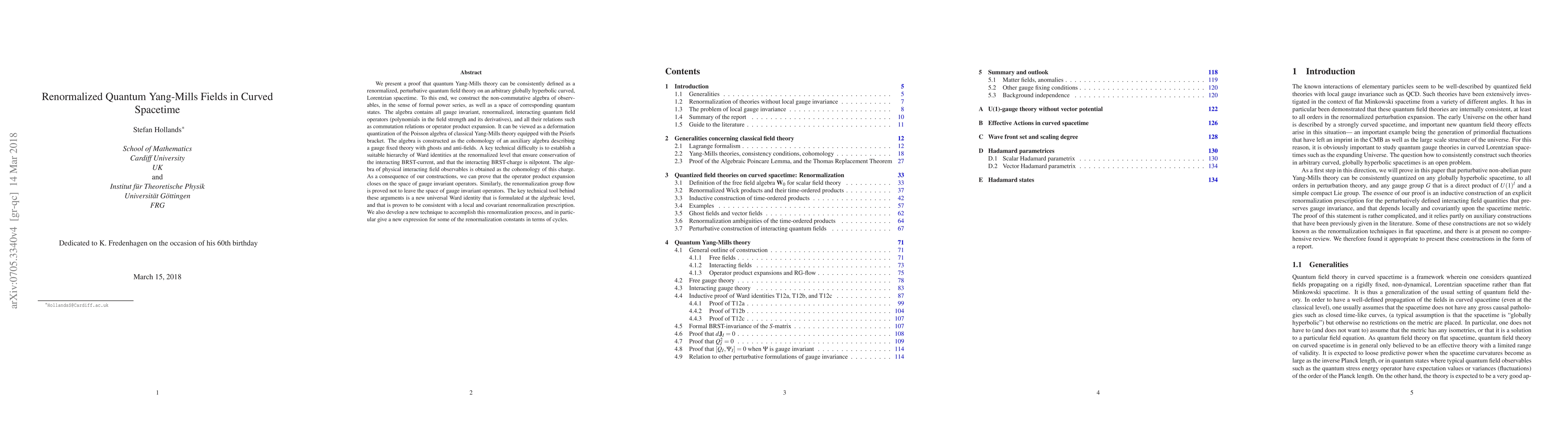 This paper proves the consistent renormalized definition of quantum Yang-Mills theory in curved spacetime, constructing a non-commutative algebra of observables and establishing a hierarchy of Ward identities to ensure the conservation of the BRST-current. The algebra's cohomology yields the physical interacting field observables, confirming the closure of the operator product expansion and the invariance of the renormalization group flow.