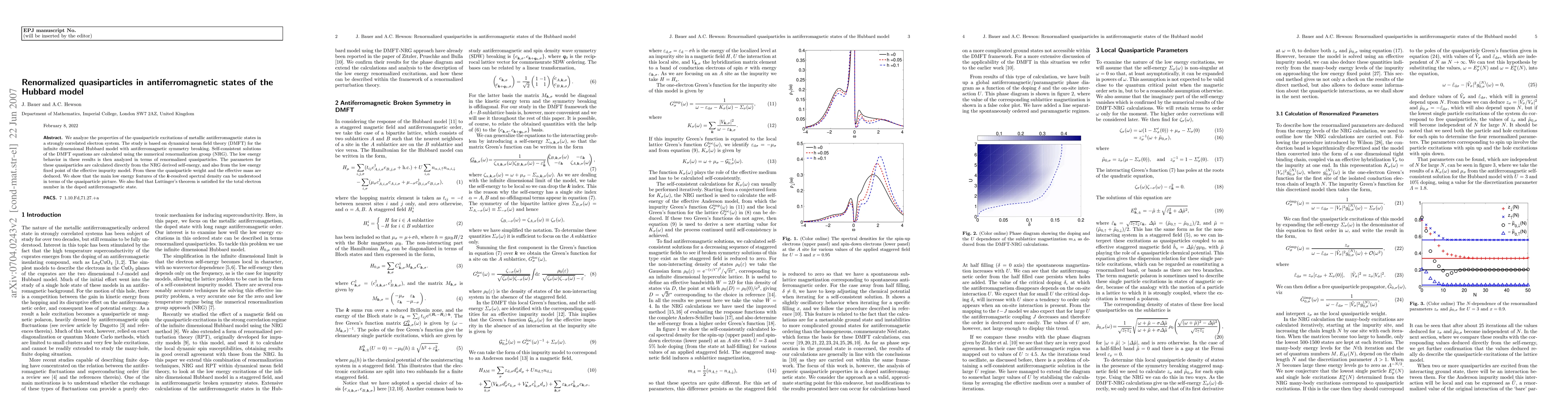 We analyze the properties of the quasiparticle excitations of metallic antiferromagnetic states in a strongly correlated electron system. The study is based on dynamical mean field theory (DMFT) for the infinite dimensional Hubbard model with antiferromagnetic symmetry breaking. Self-consistent solutions of the DMFT equations are calculated using the numerical renormalization group (NRG). The low energy behavior in these results is then analyzed in terms of renormalized quasiparticles. The parameters for these quasiparticles are calculated directly from the NRG derived self-energy, and also from the low energy fixed point of the effective impurity. They are found to be in good agreement. We show that the main low energy features of the $\bf k$-resolved spectral density can be understood in terms of the quasiparticle picture. We also find that Luttinger's theorem is satisfied for the total electron number in the doped antiferromagnetic state.