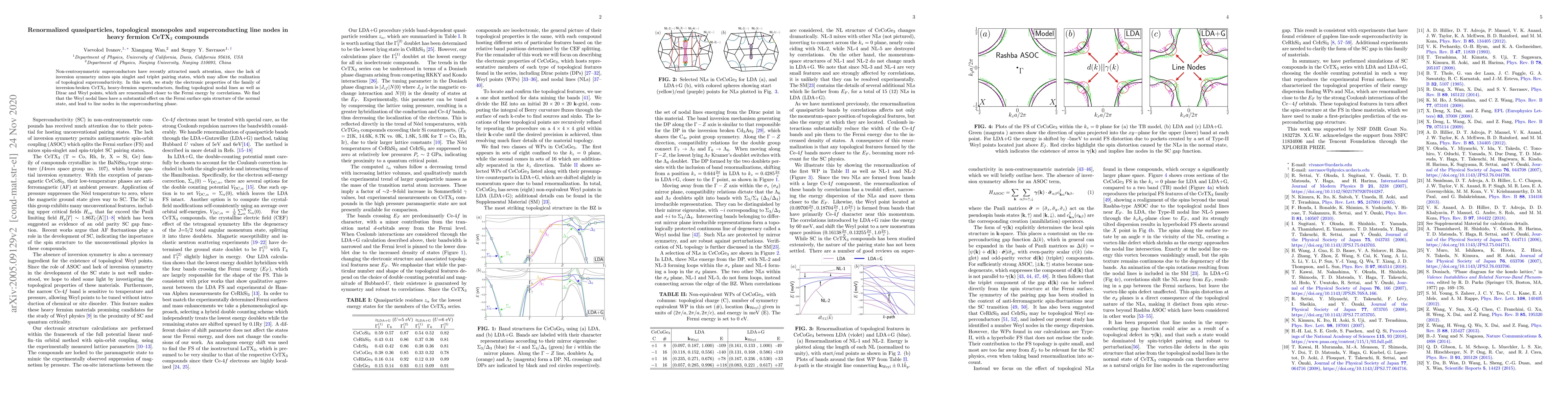 The paper investigates the electronic properties of CeTX$_3$ heavy-fermion superconductors, discovering topological nodal lines, Dirac, and Weyl points. These features are renormalized by correlations, influencing the Fermi surface spin structure of the normal state and causing line nodes in the superconducting phase.
