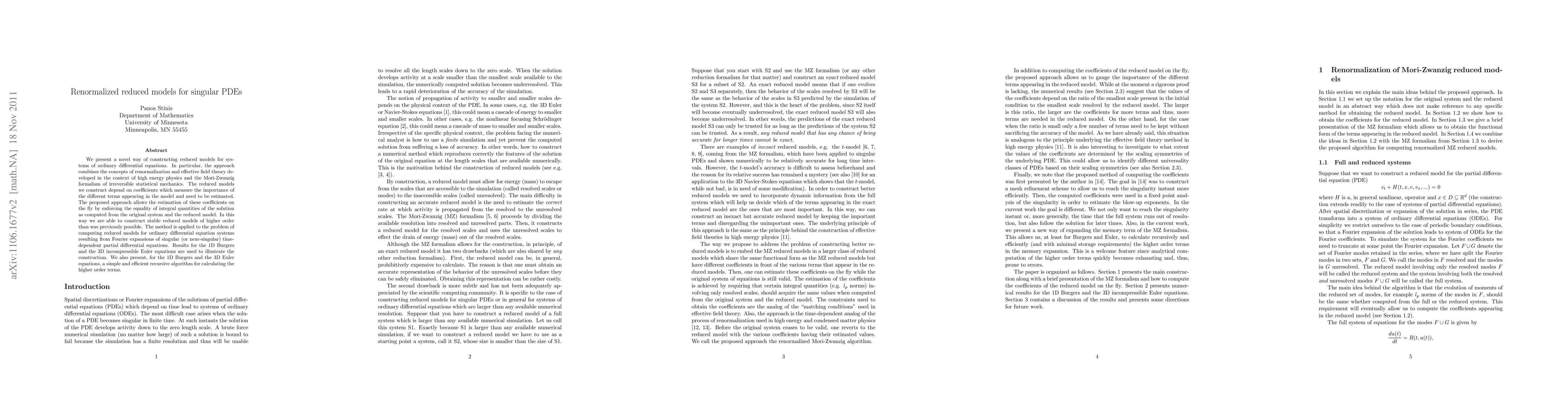 We present a novel way of constructing reduced models for systems of ordinary differential equations. The reduced models we construct depend on coefficients which measure the importance of the different terms appearing in the model and need to be estimated. The proposed approach allows the estimation of these coefficients on the fly by enforcing the equality of integral quantities of the solution as computed from the original system and the reduced model. In particular, the approach combines the concepts of renormalization and effective field theory developed in the context of high energy physics and the Mori-Zwanzig formalism of irreversible statistical mechanics. It allows to construct stable reduced models of higher order than was previously possible. The method is applied to the problem of computing reduced models for ordinary differential equation systems resulting from Fourier expansions of singular (or near-singular) time-dependent partial differential equations. Results for the 1D Burgers and the 3D incompressible Euler equations are used to illustrate the construction. We also present, for the 1D Burgers and the 3D Euler equations, a simple and efficient recursive algorithm for calculating the higher order terms.