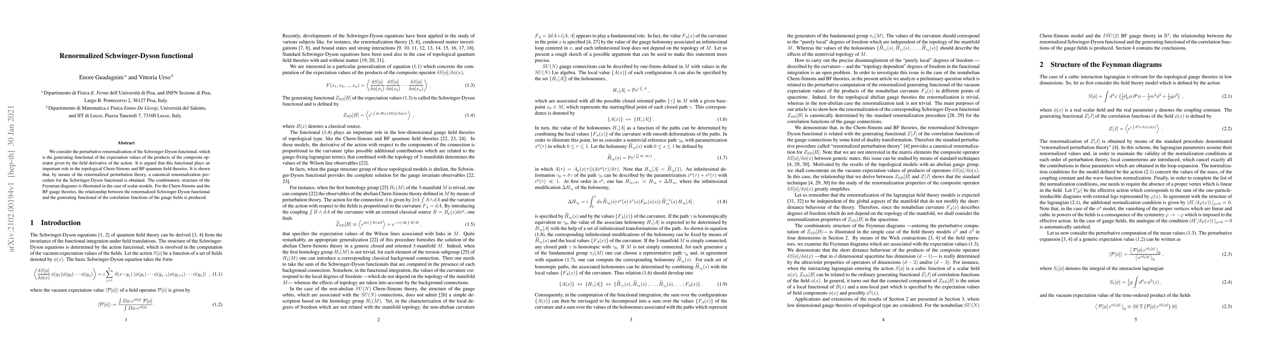 This paper explores the perturbative renormalization of the Schwinger-Dyson functional, establishing its significance in topological Chern-Simons and BF quantum field theories. It demonstrates a canonical renormalization procedure and illustrates the combinatoric structure of Feynman diagrams for scalar models, linking the renormalized Schwinger-Dyson functional to the generating functional of gauge field correlation functions.