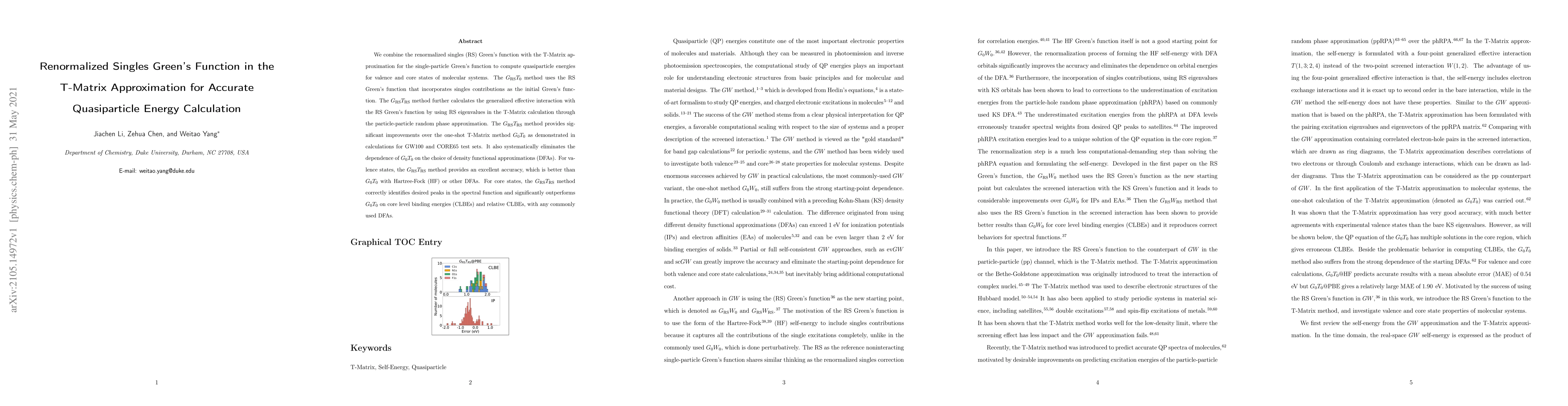 This paper introduces the $G_{\text{RS}}T_{\text{RS}}$ method for calculating quasiparticle energies in molecular systems, combining renormalized singles Green's function with the T-Matrix approximation. It significantly improves accuracy over the $G_0T_0$ method, especially for valence and core states, and reduces dependence on density functional approximations.
