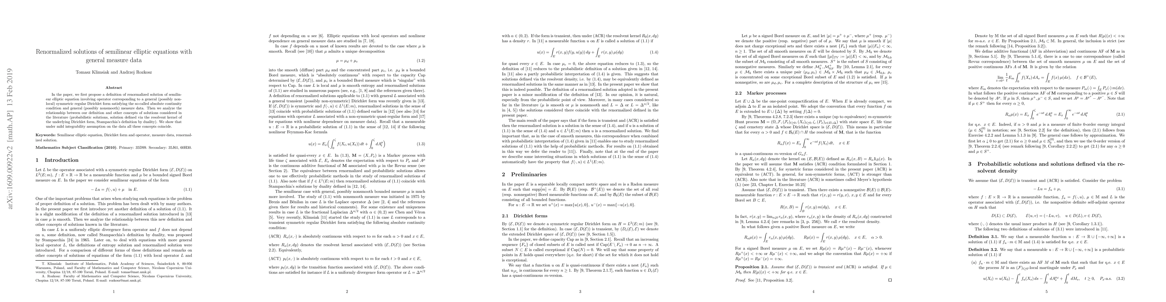 This paper introduces a renormalized solution definition for semilinear elliptic equations with general measure data, and demonstrates its equivalence to other solution concepts under mild integrability conditions. The analysis connects this definition to probabilistic solutions, resolvent kernel solutions, and Stampacchia's duality approach.