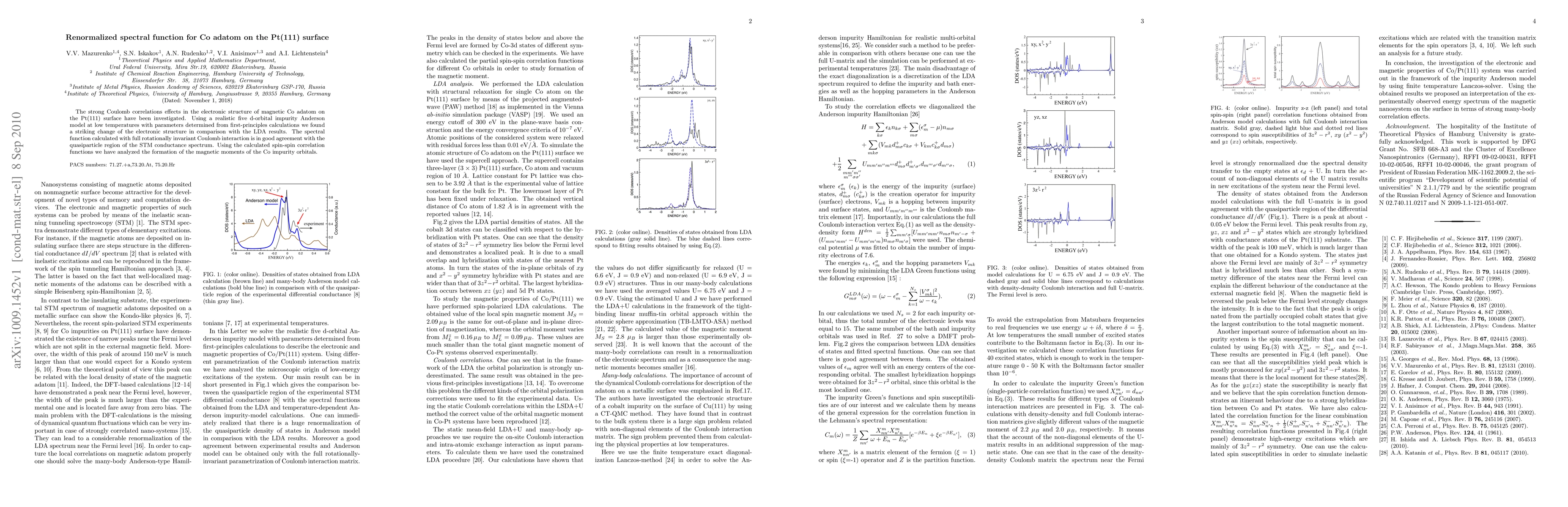 The strong Coulomb correlations effects in the electronic structure of magnetic Co adatom on the Pt(111) surface have been investigated. Using a realistic five d-orbital impurity Anderson model at low temperatures with parameters determined from first-principles calculations we found a striking change of the electronic structure in comparison with the LDA results. The spectral function calculated with full rotationally invariant Coulomb interaction is in good agreement with the quasiparticle region of the STM conductance spectrum. Using the calculated spin-spin correlation functions we have analyzed the formation of the magnetic moments of the Co impurity orbitals.