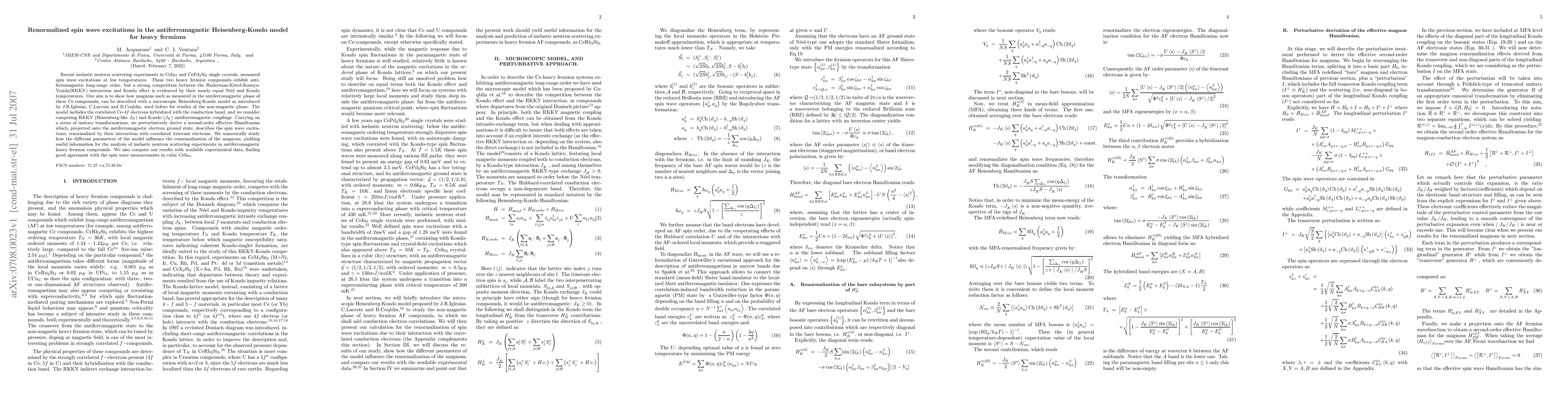 This paper investigates the renormalized spin wave excitations in the antiferromagnetic Heisenberg-Kondo model for heavy fermions, using a microscopic model to describe the behavior of CeIn3 and CePd2Si2. The study derives a second-order effective Hamiltonian that accounts for interactions between magnons and correlated electrons, providing insights into the renormalization effects observed in neutron scattering experiments.