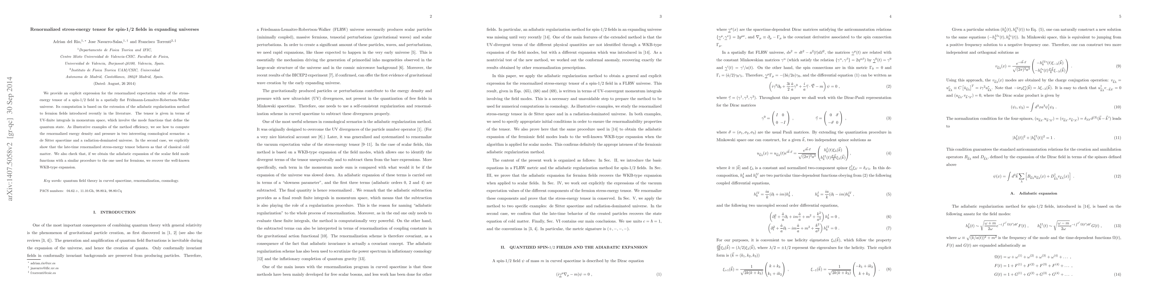 This paper provides an explicit expression for the renormalized stress-energy tensor of spin-1/2 fields in expanding universes using adiabatic regularization. It demonstrates the method's efficiency by computing the renormalized energy density and pressure in de Sitter and radiation-dominated universes.