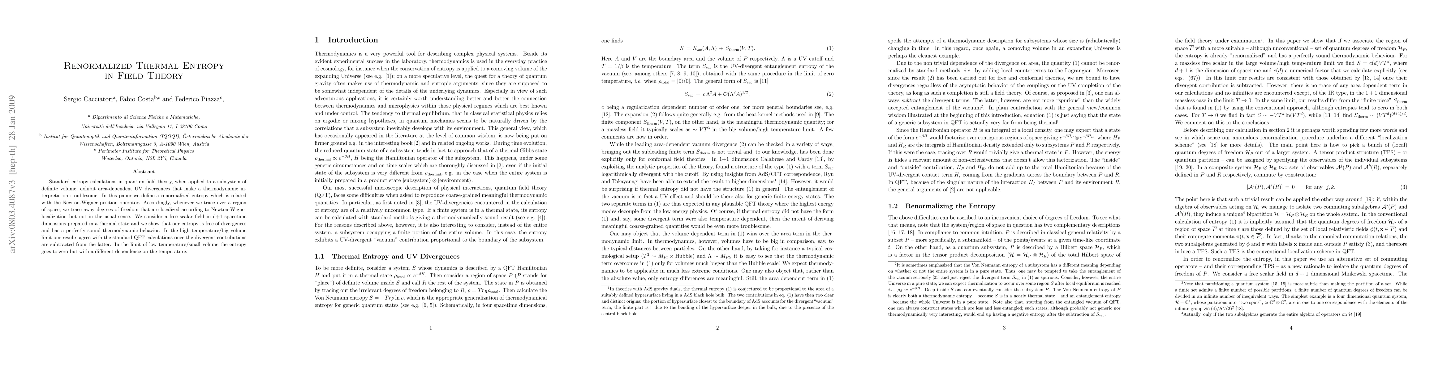 Standard entropy calculations in quantum field theory, when applied to a subsystem of definite volume, exhibit area-dependent UV divergences that make a thermodynamic interpretation troublesome. In this paper we define a renormalized entropy which is related with the Newton-Wigner position operator. Accordingly, whenever we trace over a region of space, we trace away degrees of freedom that are localized according to Newton-Wigner localization but not in the usual sense. We consider a free scalar field in d+1 spacetime dimensions prepared in a thermal state and we show that our entropy is free of divergences and has a perfectly sound thermodynamic behavior. In the high temperature/big volume limit our results agree with the standard QFT calculations once the divergent contributions are subtracted from the latter. In the limit of low temperature/small volume the entropy goes to zero but with a different dependence on the temperature.