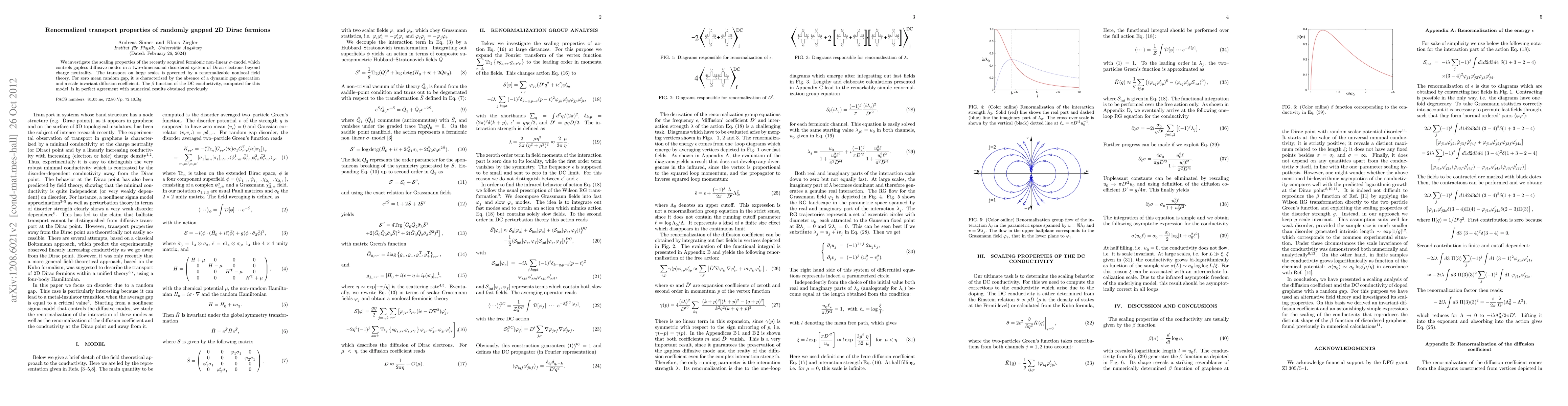 We investigate the scaling properties of the recently acquired fermionic non--linear $\sigma$--model which controls gapless diffusive modes in a two--dimensional disordered system of Dirac electrons beyond charge neutrality. The transport on large scales is governed by a novel renormalizable nonlocal field theory. For zero mean random gap, it is characterized by the absence of a dynamic gap generation and a scale invariant diffusion coefficient. The $\beta$ function of the DC conductivity, computed for this model, is in perfect agreement with numerical results obtained previously.