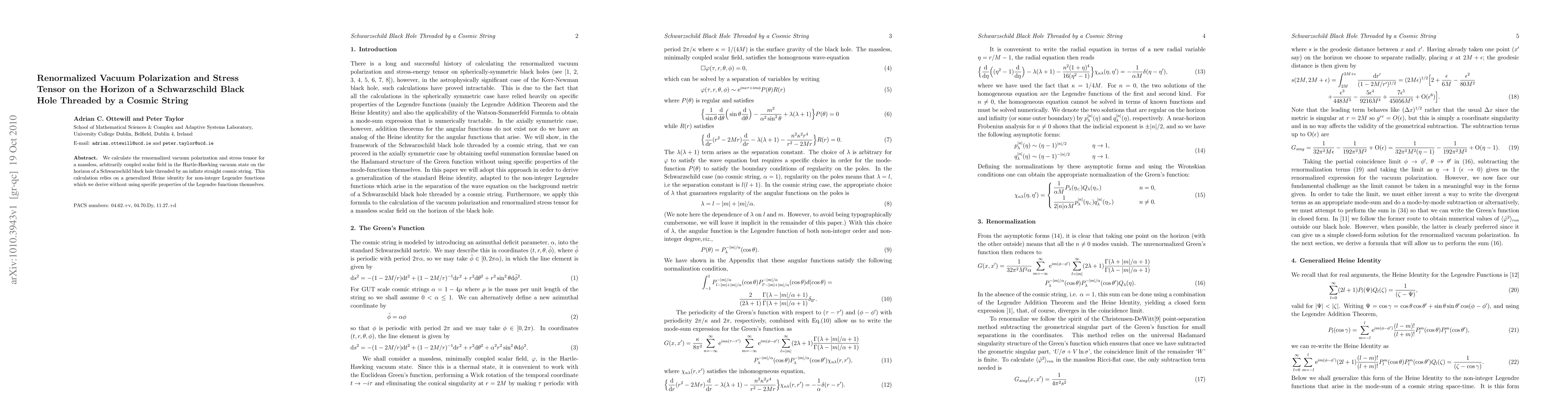 Summary: The paper calculates the renormalized vacuum polarization and stress tensor for a scalar field in the Hartle-Hawking vacuum on a Schwarzschild black hole's horizon with a cosmic string, using a novel generalized Heine identity for non-integer Legendre functions.
