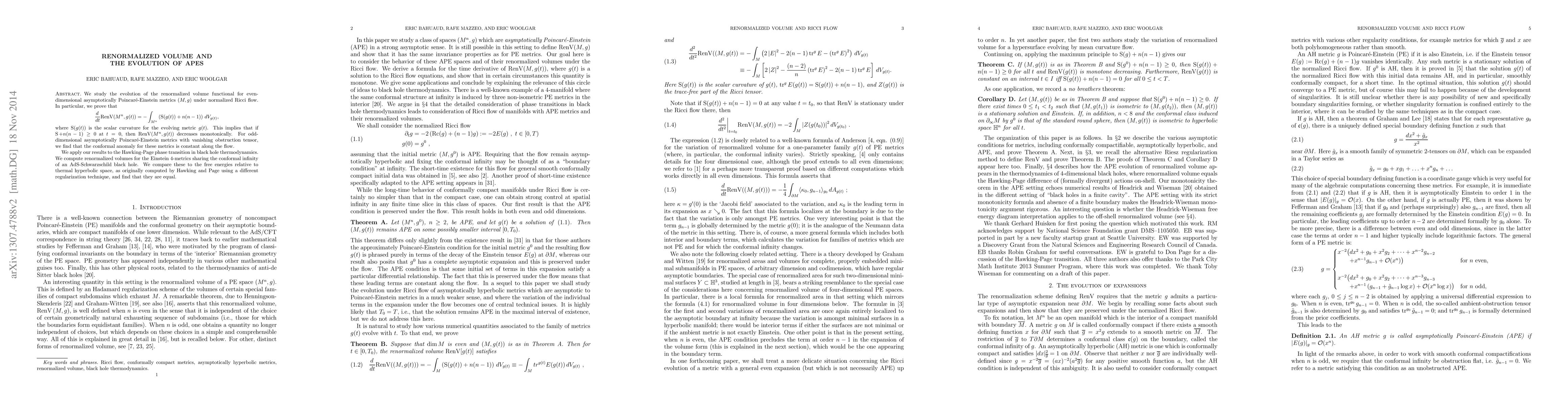This research derives that the time derivative of the renormalized volume for evolving asymptotically Poincare-Einstein metrics under normalized Ricci flow is the negative integral of the scalar curvature plus a constant. The study shows that the renormalized volume decreases monotonically if the initial scalar curvature plus constant is non-negative, and interprets these results in the context of the Hawking-Page phase transition in four dimensions, linking renormalized volume differences to the action difference and free energy released in the transition.
