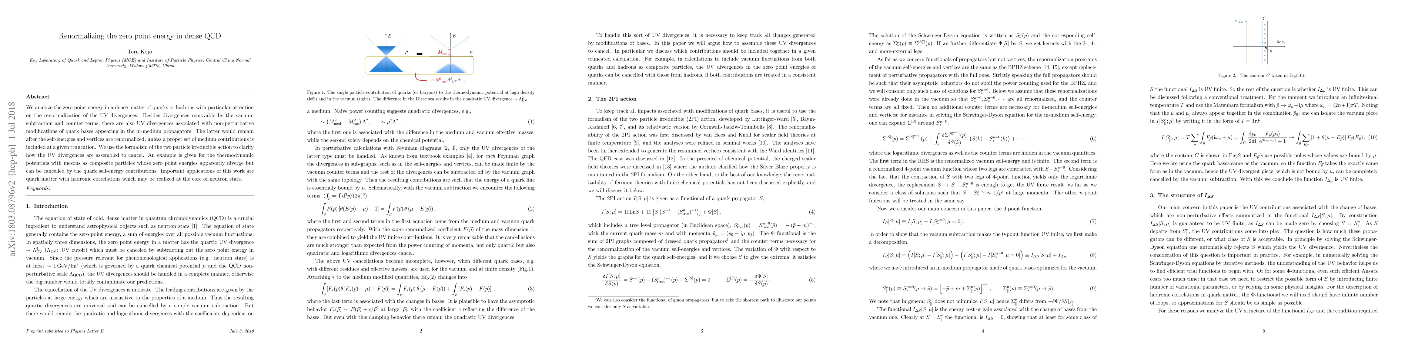 We analyze the zero point energy in a dense matter of quarks or hadrons with particular attention on the renormalization of the UV divergences. Besides divergences removable by the vacuum subtraction and counter terms, there are also UV divergences associated with non-perturbative modifications of quark bases appearing in the in-medium propagators. The latter would remain after the self-energies and vertices are renormalized, unless a proper set of medium contributions is included at a given truncation. We use the formalism of the two particle irreducible action to clarify how the UV divergences are assembled to cancel. An example is given for the thermodynamic potentials with mesons as composite particles whose zero point energies apparently diverge but can be cancelled by the quark self-energy contributions. Important applications of this work are quark matter with hadronic correlations which may be realized at the core of neutron stars.