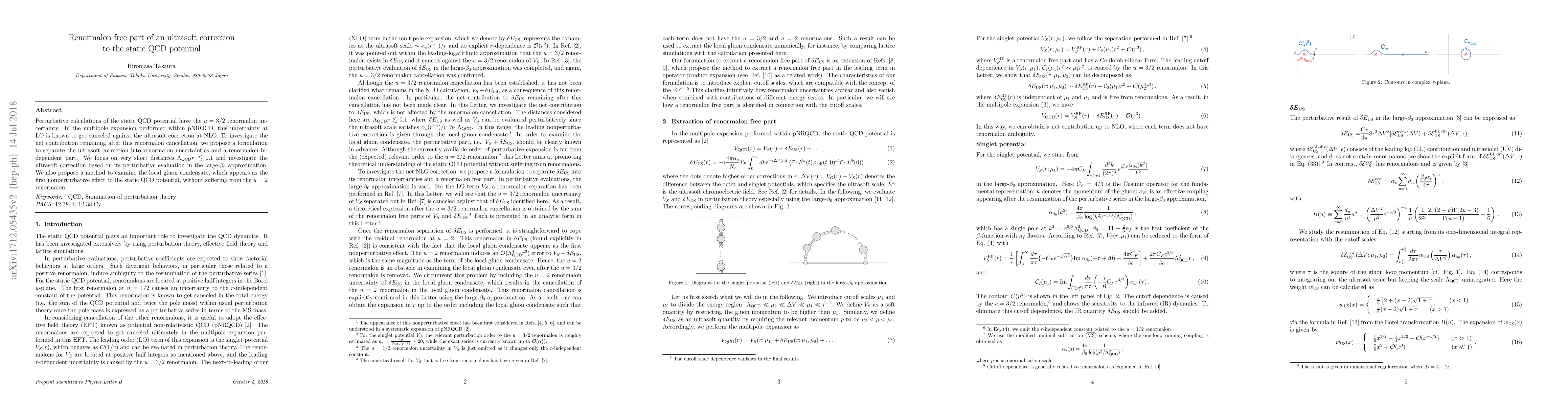 This paper investigates the renormalon-free part of the ultrasoft correction to the static QCD potential, focusing on the cancellation of $u=3/2$ renormalon uncertainties at short distances. It proposes a method to separate the ultrasoft correction into renormalon and renormalon-independent components, and examines the local gluon condensate without $u=2$ renormalon interference.