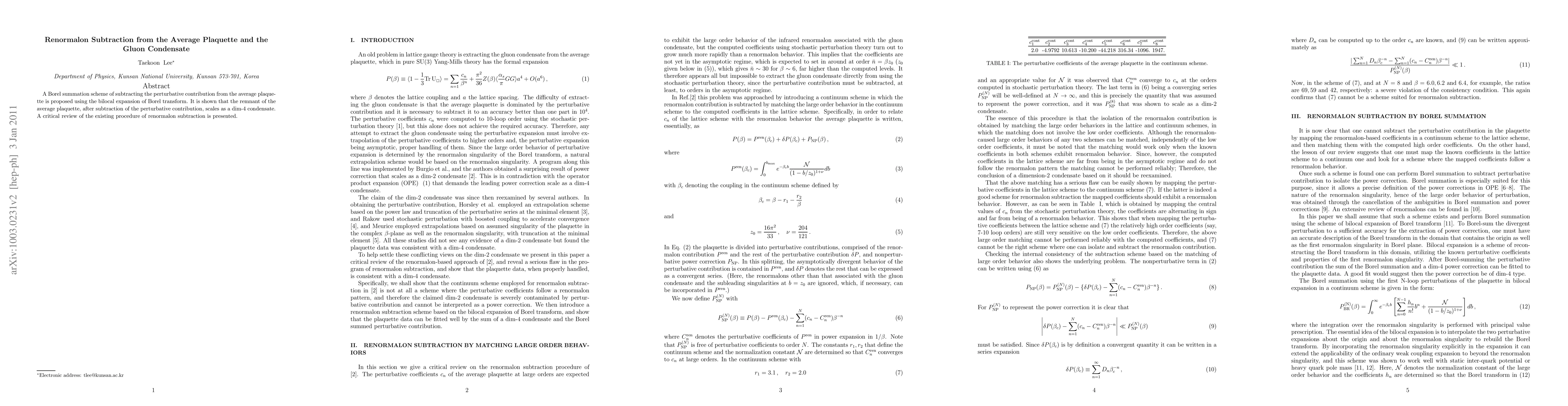 This paper proposes a Borel resummation method to subtract perturbative contributions from the average plaquette, revealing that the remaining term scales as a dimension-4 gluon condensate. It also critically reviews current renormalon subtraction techniques.