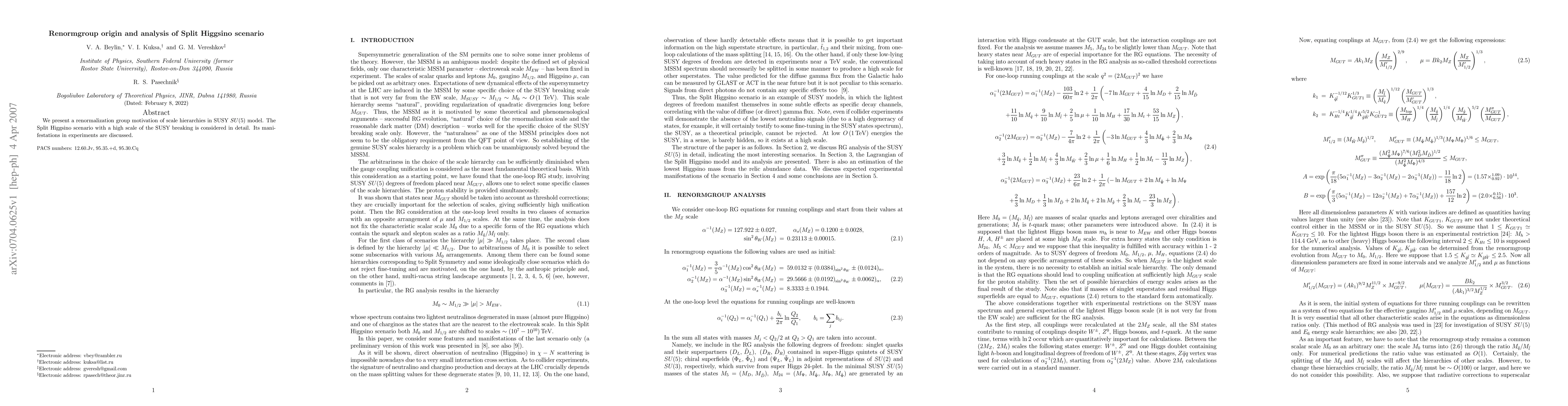 We present a renormalization group motivation of scale hierarchies in SUSY SU(5) model. The Split Higgsino scanrio with a high scale of the SUSY breaking is considered in detail. Its manifestations in experiments are discussed.
