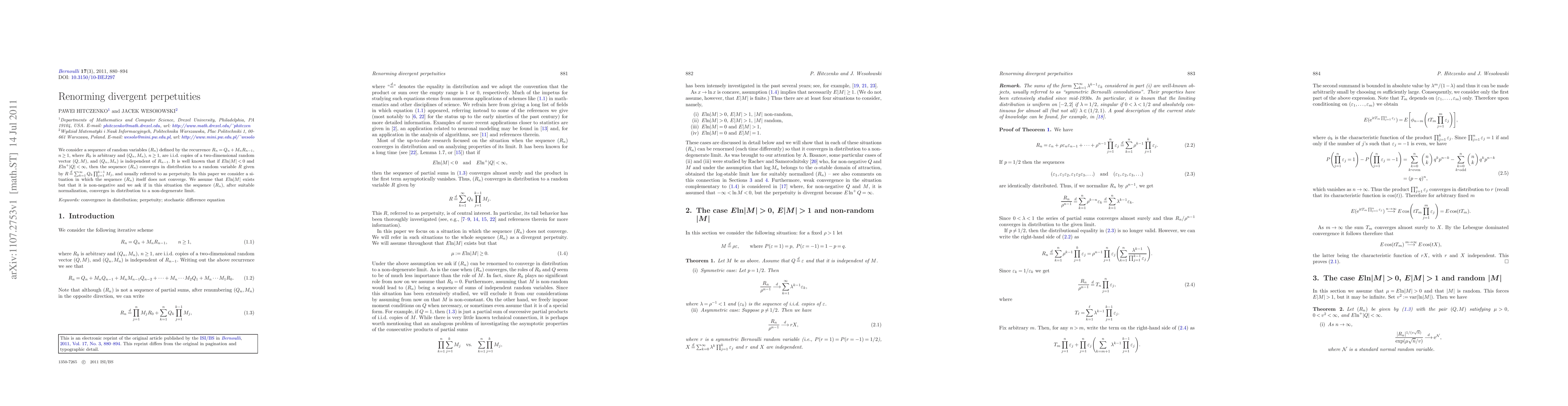We consider a sequence of random variables $(R_n)$ defined by the recurrence $R_n=Q_n+M_nR_{n-1}$, $n\ge1$, where $R_0$ is arbitrary and $(Q_n,M_n)$, $n\ge1$, are i.i.d. copies of a two-dimensional random vector $(Q,M)$, and $(Q_n,M_n)$ is independent of $R_{n-1}$. It is well known that if $E{\ln}|M|<0$ and $E{\ln^+}|Q|<\infty$, then the sequence $(R_n)$ converges in distribution to a random variable $R$ given by $R\stackrel{d}{=}\sum_{k=1}^{\infty}Q_k\prod_{j=1}^{k-1}M_j$, and usually referred to as perpetuity. In this paper we consider a situation in which the sequence $(R_n)$ itself does not converge. We assume that $E{\ln}|M|$ exists but that it is non-negative and we ask if in this situation the sequence $(R_n)$, after suitable normalization, converges in distribution to a non-degenerate limit.