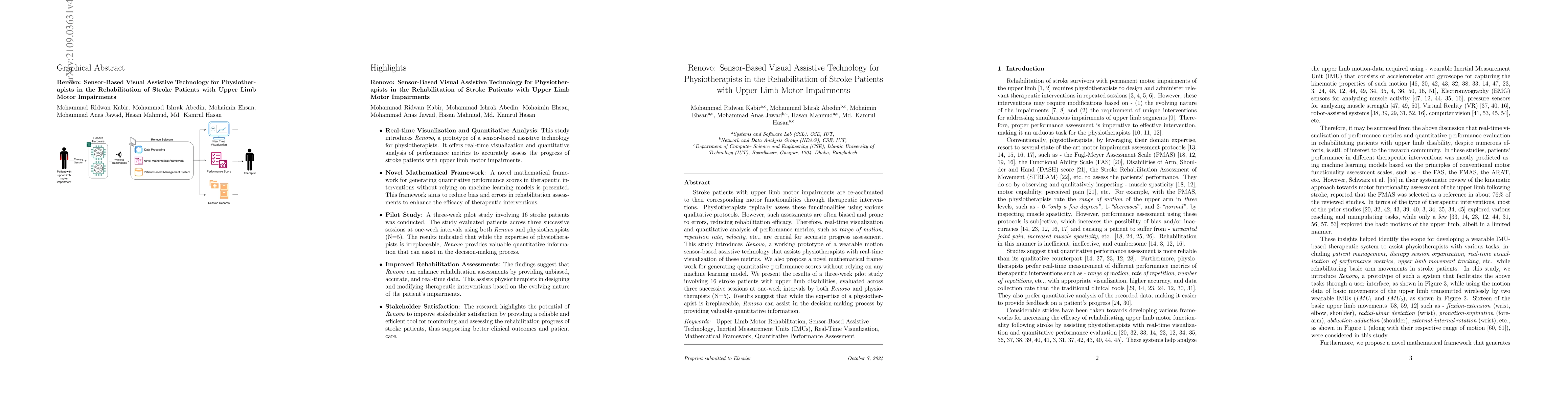 Renovo is a low-cost sensor-based therapeutic system for upper limb rehabilitation, aiding physiotherapists in real-time assessment and providing patients with progress feedback. A pilot study showed that sensor-based quantitative assessment reduces human error and bias, improving rehabilitation efficiency.