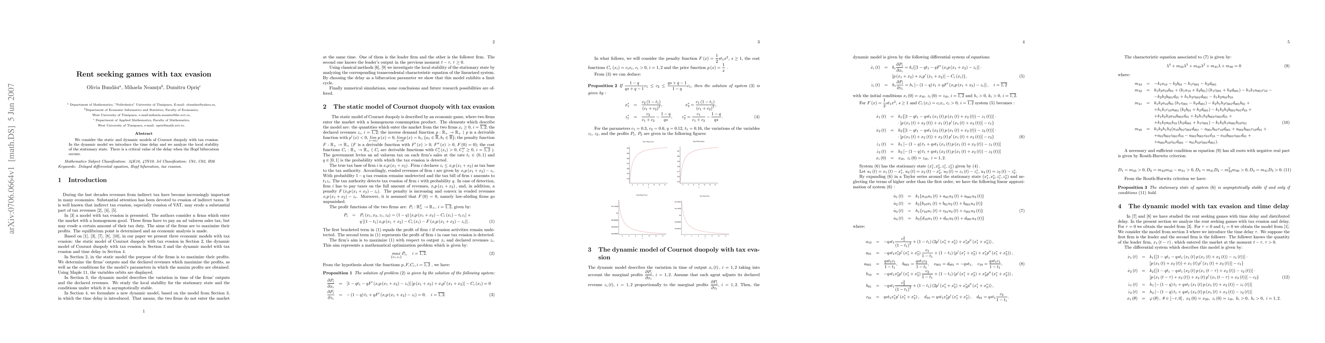 This paper examines Cournot duopoly models with tax evasion, both static and dynamic, focusing on the local stability of the stationary state in the dynamic model. A critical time delay value is identified where a Hopf bifurcation occurs, indicating a shift in the system's stability.