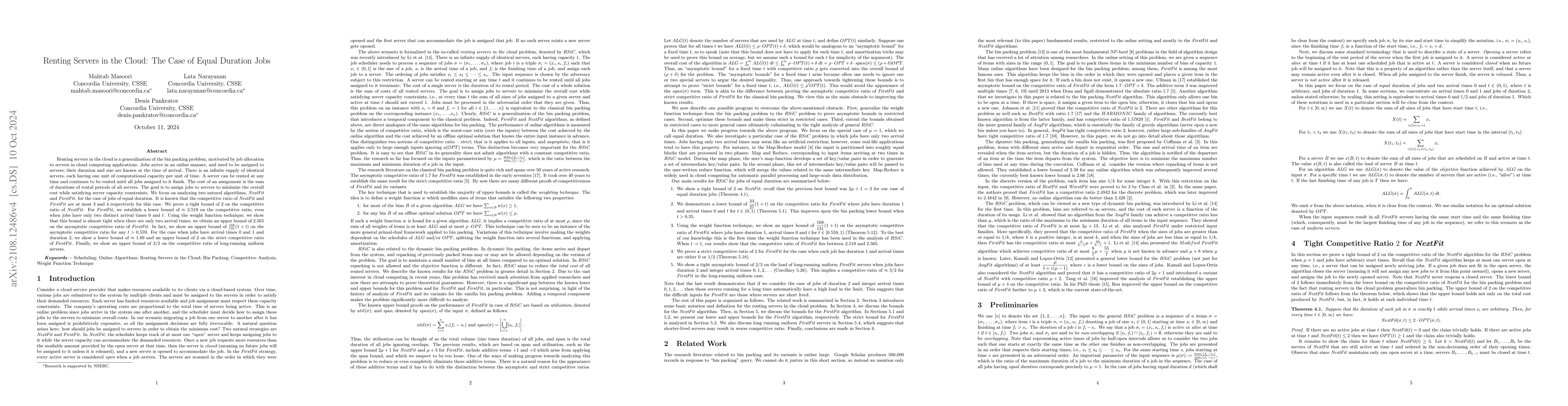 The paper analyzes the RSiC problem, focusing on job allocation to servers in cloud computing with equal duration jobs, using NextFit and FirstFit algorithms.