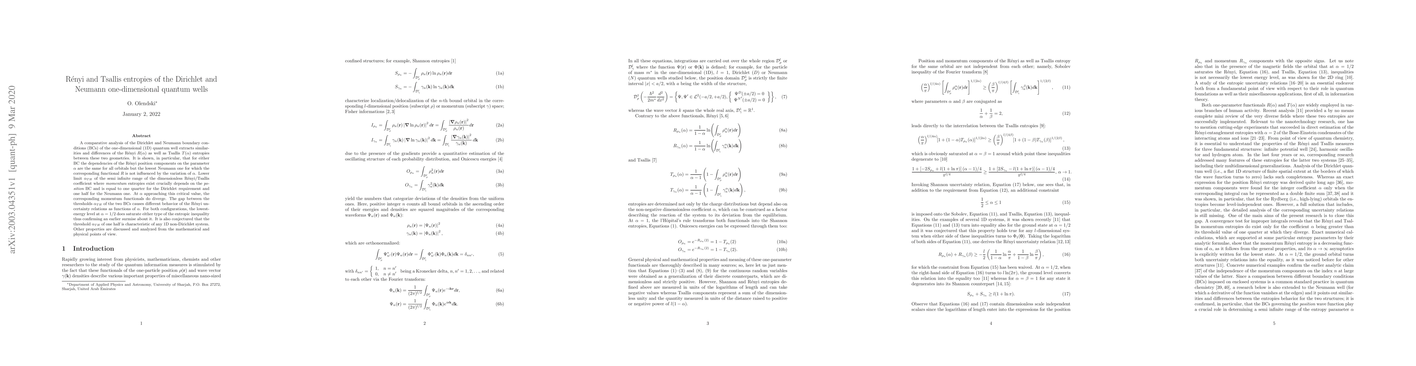 This paper compares Rényi and Tsallis entropies for Dirichlet and Neumann boundary conditions in 1D quantum wells, revealing that Rényi position components behave similarly for all orbitals except the lowest Neumann one. The lower limit of the dimensionless coefficient for momentum entropies depends on the position boundary condition, leading to different behaviors of Rényi uncertainty relations.