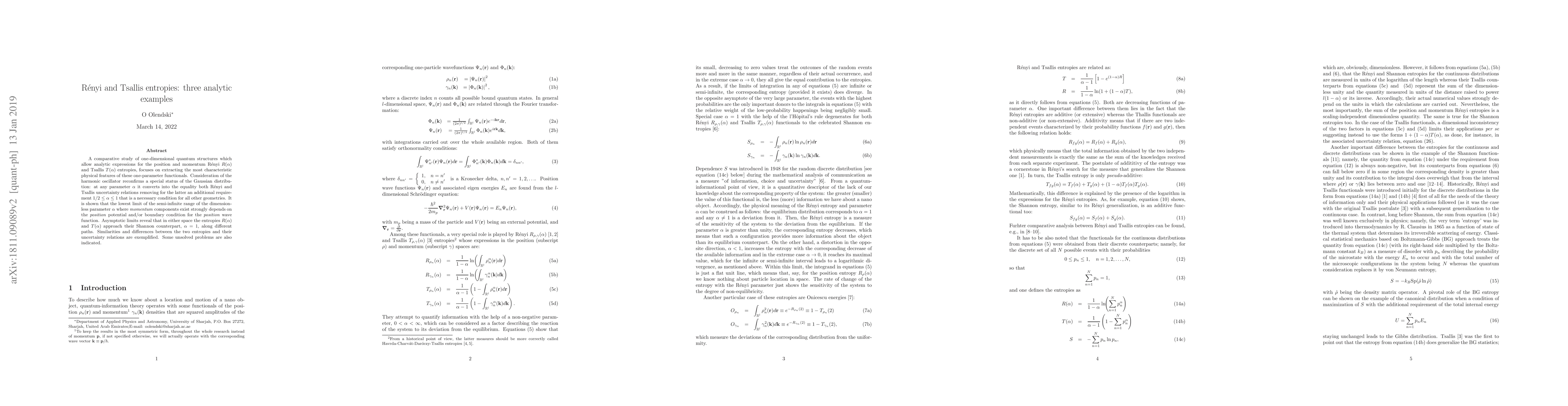 A comparative study of one-dimensional quantum structures which allow analytic expressions for the position and momentum R\'{e}nyi $R(\alpha)$ and Tsallis $T(\alpha)$ entropies, focuses on extracting the most characteristic physical features of these one-parameter functionals. Consideration of the harmonic oscillator reconfirms a special status of the Gaussian distribution: at any parameter $\alpha$ it converts into the equality both R\'{e}nyi and Tsallis uncertainty relations removing for the latter an additional requirement $1/2\leq\alpha\leq1$ that is a necessary condition for all other geometries. It is shown that the lowest limit of the semi infinite range of the dimensionless parameter $\alpha$ where \emph{momentum} components exist strongly depends on the \emph{position} potential and/or boundary condition for the \emph{position} wave function. Asymptotic limits reveal that in either space the entropies $R(\alpha)$ and $T(\alpha)$ approach their Shannon counterpart, $\alpha=1$, along different paths. Similarities and differences between the two entropies and their uncertainty relations are exemplified. Some unsolved problems are pointed at too.