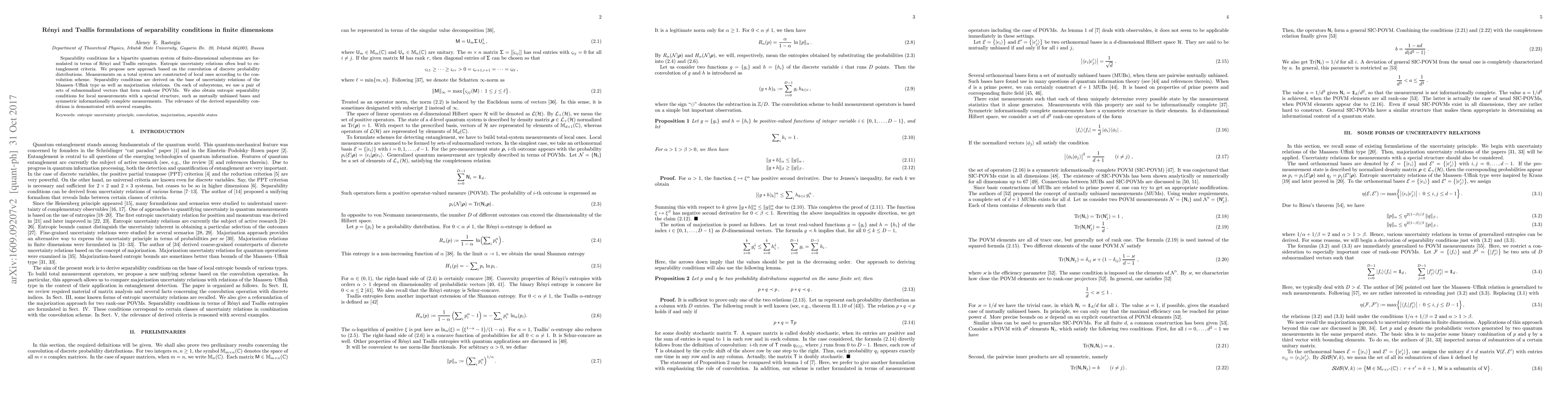 This paper formulates separability conditions for finite-dimensional bipartite quantum systems using Rényi and Tsallis entropies. It proposes a new approach based on the convolution of discrete probability distributions and derives conditions using uncertainty relations and majorization, demonstrating their relevance with various examples.