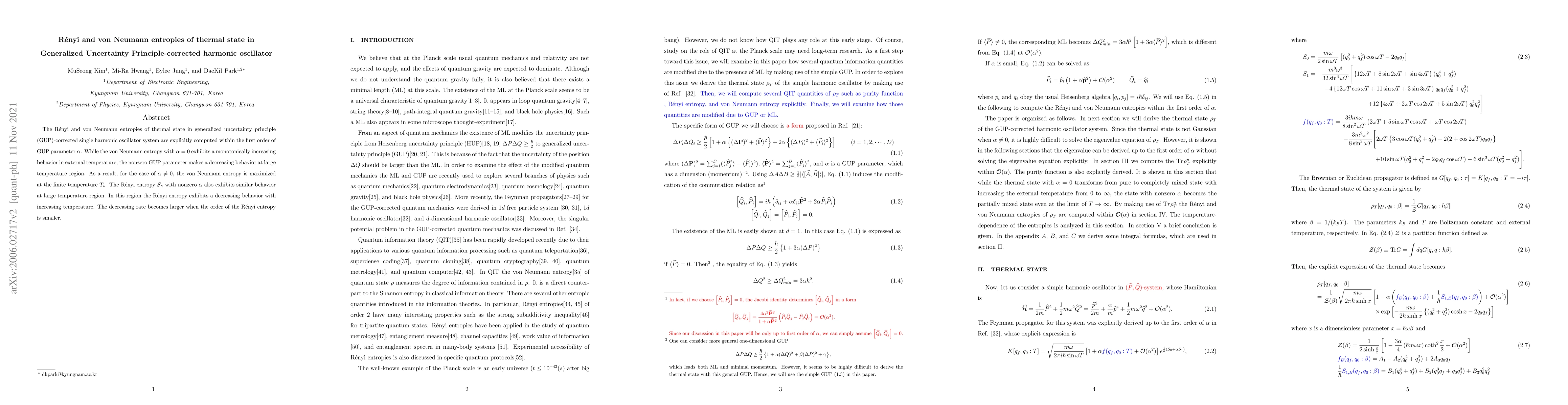 The R\'{e}nyi and von Neumann entropies of the thermal state in the generalized uncertainty principle (GUP)-corrected single harmonic oscillator system are explicitly computed within the first order of the GUP parameter $\alpha$. While the von Neumann entropy with $\alpha = 0$ exhibits a monotonically increasing behavior in external temperature, the nonzero GUP parameter makes the decreasing behavior of the von Neumann entropy at the large temperature region. As a result, the von Neumann entropy is maximized at the finite temperature if $\alpha \neq 0$. The R\'{e}nyi entropy $S_{\gamma}$ with nonzero $\alpha$ also exhibits similar behavior at the large temperature region. In this region the R\'{e}nyi entropy exhibit decreasing behavior with increasing the temperature. The decreasing rate becomes larger when the order of the R\'{e}nyi entropy $\gamma$ is smaller.