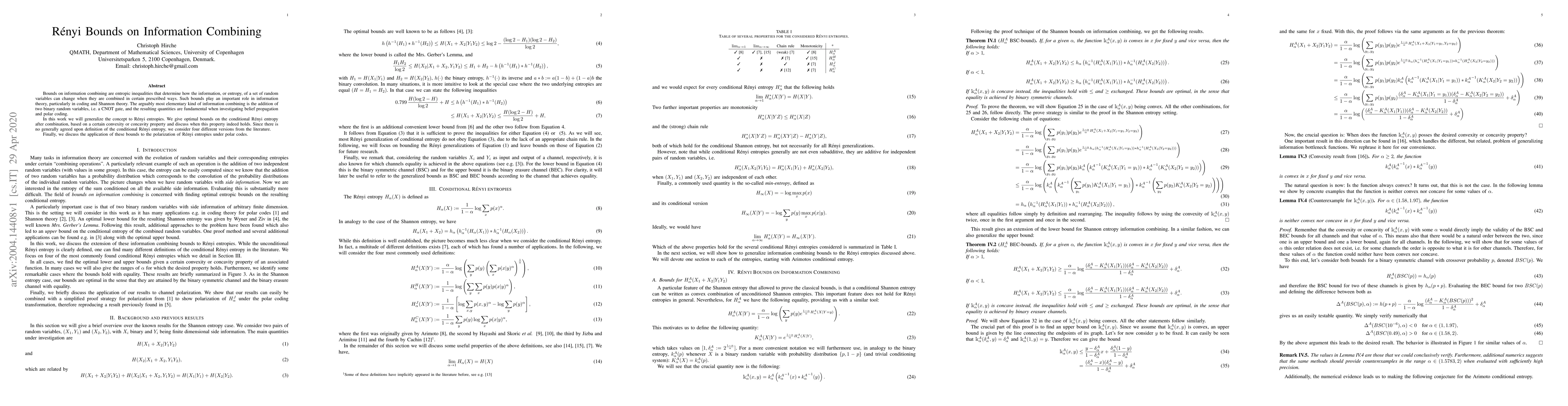 This paper generalizes bounds on information combining to Rényi entropies, providing optimal bounds on conditional Rényi entropy based on convexity or concavity properties. It discusses four definitions of conditional Rényi entropy and applies these bounds to the polarization of Rényi entropies in polar coding.