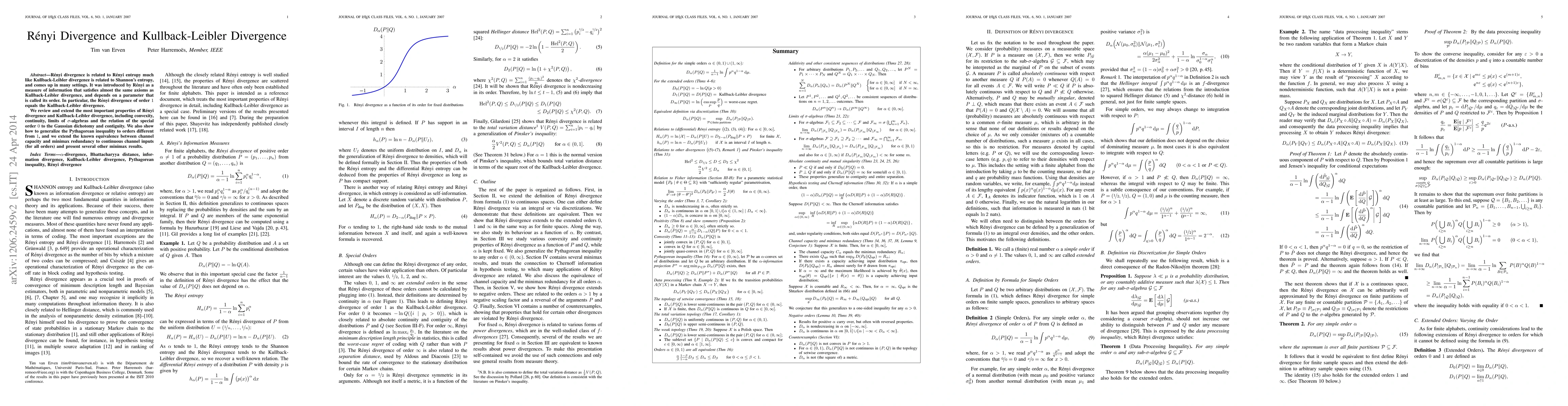 R\'enyi divergence is related to R\'enyi entropy much like Kullback-Leibler divergence is related to Shannon's entropy, and comes up in many settings. It was introduced by R\'enyi as a measure of information that satisfies almost the same axioms as Kullback-Leibler divergence, and depends on a parameter that is called its order. In particular, the R\'enyi divergence of order 1 equals the Kullback-Leibler divergence. We review and extend the most important properties of R\'enyi divergence and Kullback-Leibler divergence, including convexity, continuity, limits of $\sigma$-algebras and the relation of the special order 0 to the Gaussian dichotomy and contiguity. We also show how to generalize the Pythagorean inequality to orders different from 1, and we extend the known equivalence between channel capacity and minimax redundancy to continuous channel inputs (for all orders) and present several other minimax results.