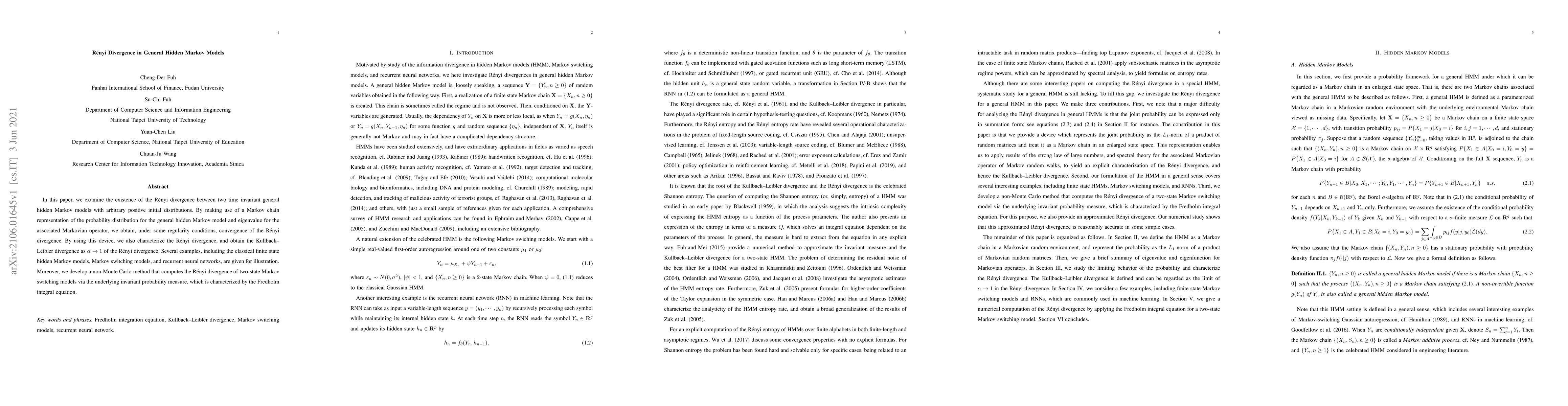 In this paper, we examine the existence of the R\'enyi divergence between two time invariant general hidden Markov models with arbitrary positive initial distributions. By making use of a Markov chain representation of the probability distribution for the general hidden Markov model and eigenvalue for the associated Markovian operator, we obtain, under some regularity conditions, convergence of the R\'enyi divergence. By using this device, we also characterize the R\'enyi divergence, and obtain the Kullback-Leibler divergence as {\alpha} \rightarrow 1 of the R\'enyi divergence. Several examples, including the classical finite state hidden Markov models, Markov switching models, and recurrent neural networks, are given for illustration. Moreover, we develop a non-Monte Carlo method that computes the R\'enyi divergence of two-state Markov switching models via the underlying invariant probability measure, which is characterized by the Fredholm integral equation.