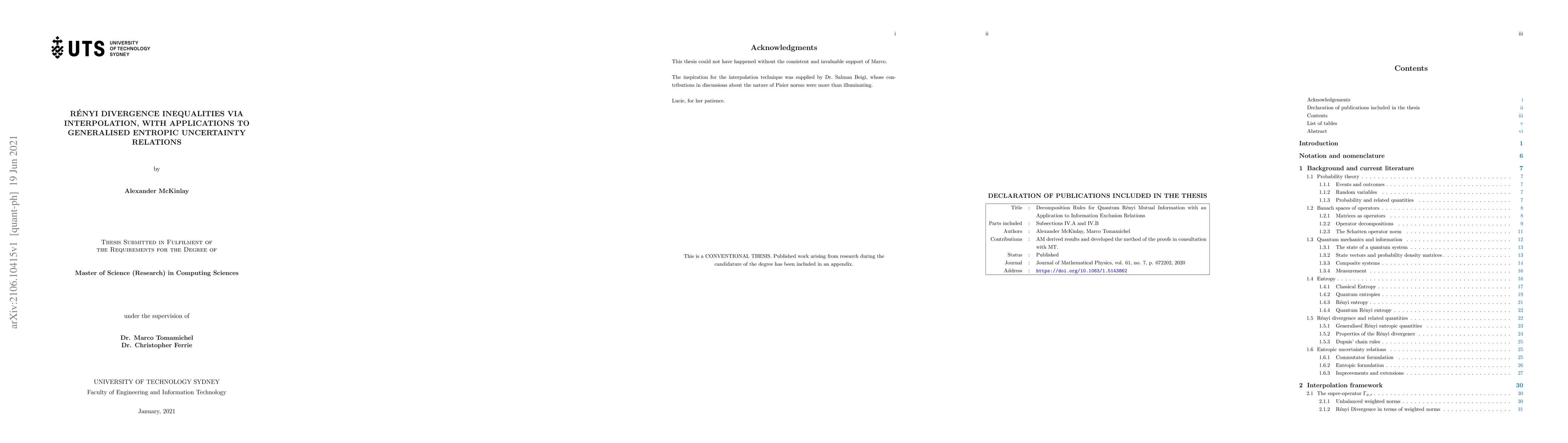 This paper develops new R\'enyi divergence inequalities via interpolation, establishing mutual information decomposition rules and chain rules for R\'enyi conditional entropy. These results enable the derivation of R\'enyi entropic uncertainty relations, generalising and improving existing uncertainty principles.