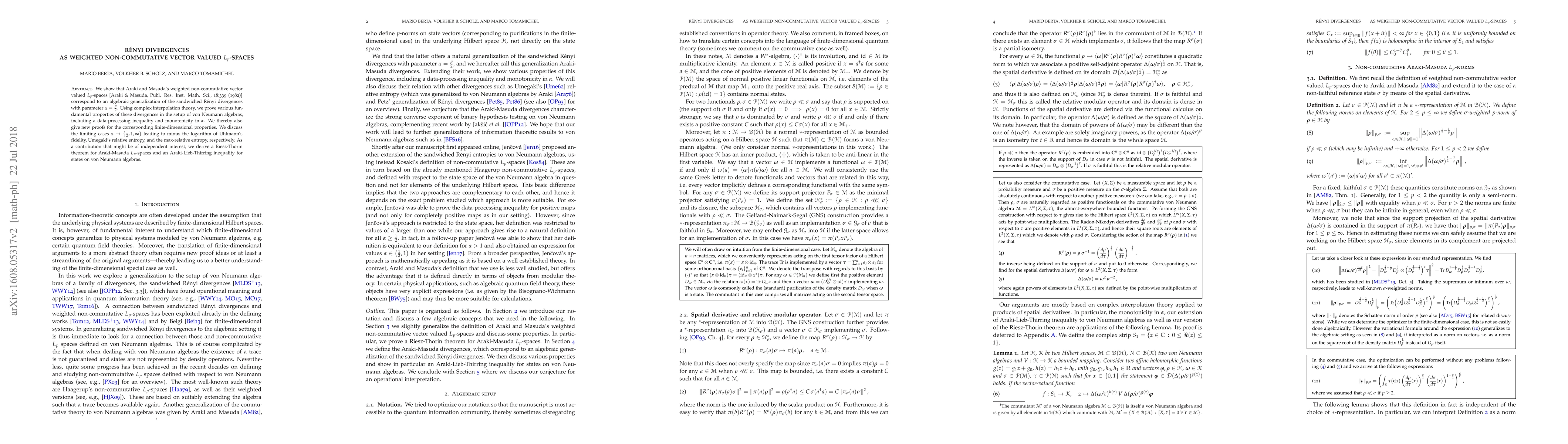 We show that Araki and Masuda's weighted non-commutative vector valued $L_p$-spaces [Araki \& Masuda, Publ. Res. Inst. Math. Sci., 18:339 (1982)] correspond to an algebraic generalization of the sandwiched R\'enyi divergences with parameter $\alpha = \frac{p}{2}$. Using complex interpolation theory, we prove various fundamental properties of these divergences in the setup of von Neumann algebras, including a data-processing inequality and monotonicity in $\alpha$. We thereby also give new proofs for the corresponding finite-dimensional properties. We discuss the limiting cases $\alpha\to \{\frac{1}{2},1,\infty\}$ leading to minus the logarithm of Uhlmann's fidelity, Umegaki's relative entropy, and the max-relative entropy, respectively. As a contribution that might be of independent interest, we derive a Riesz-Thorin theorem for Araki-Masuda $L_p$-spaces and an Araki-Lieb-Thirring inequality for states on von Neumann algebras.