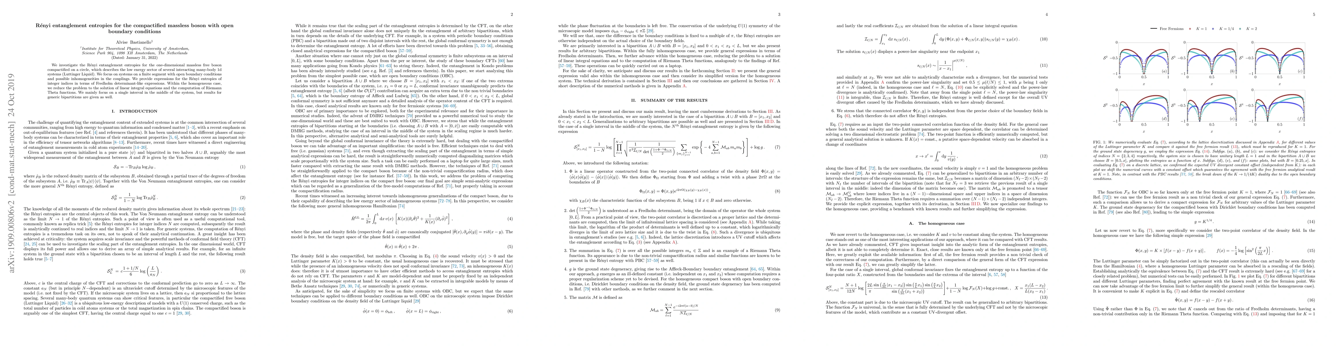 This paper investigates R\'enyi entanglement entropies for a one-dimensional massless free boson on a circle with open boundary conditions, focusing on the Luttinger Liquid model. It provides expressions for R\'enyi entropies in terms of Fredholm determinants and solves linear integral equations and Riemann Theta functions for homogeneous cases.