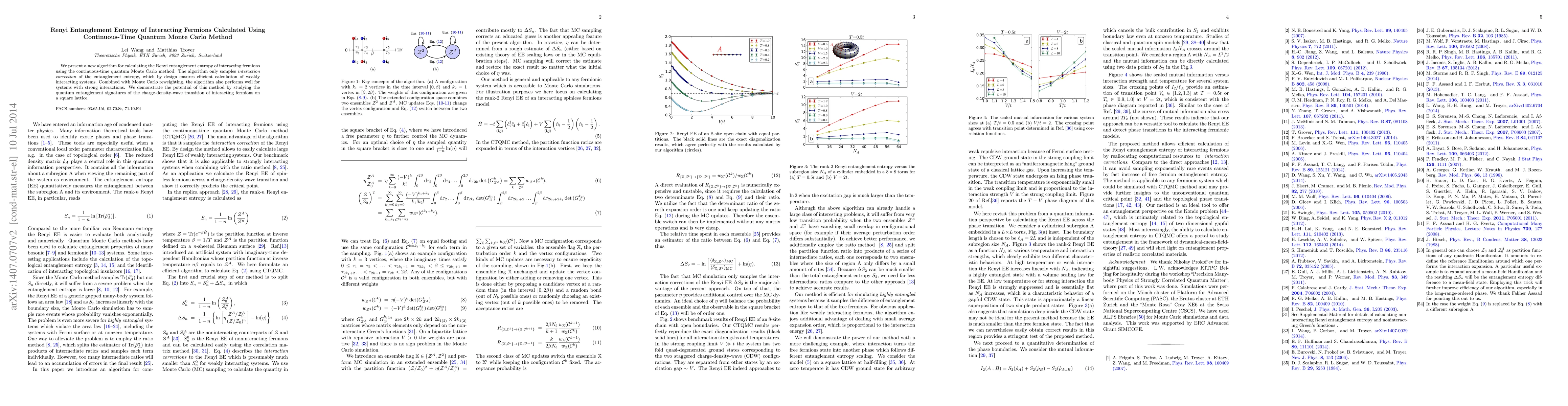 This paper introduces a new continuous-time quantum Monte Carlo method for calculating Renyi entanglement entropy in weakly to strongly interacting fermion systems, demonstrating its effectiveness through the study of charge-density-wave transitions on a square lattice.
