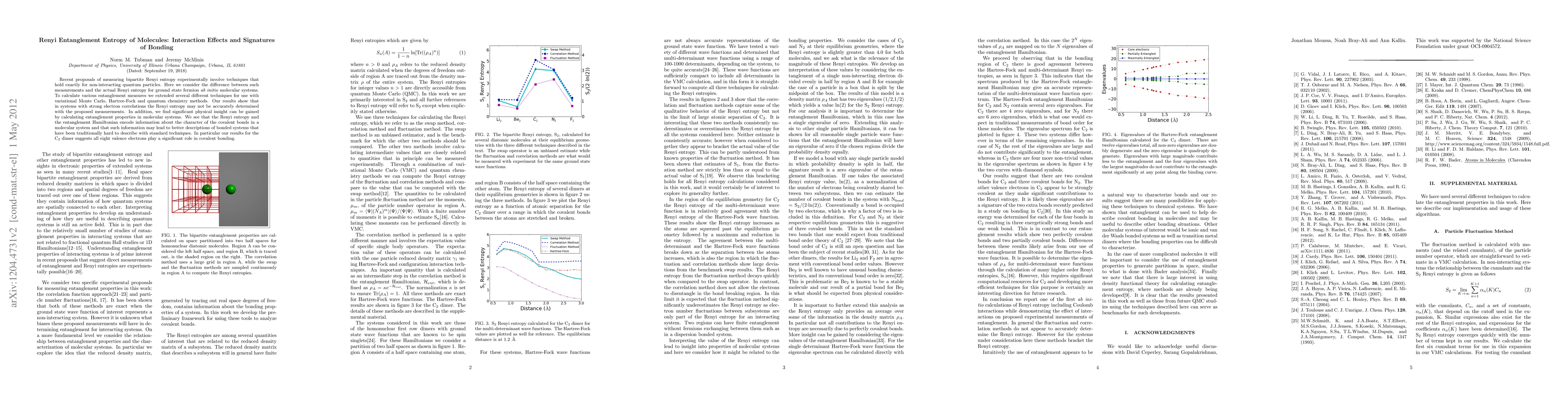 Recent proposals of measuring bipartite Renyi entropy experimentally involve techniques that hold exactly for non-interacting quantum particles. Here we consider the difference between such measurements and the actual Renyi entropy for ground state fermion ab initio molecular systems. To calculate various entanglement measures we extended several different techniques for use with variational Monte Carlo, Hartree-Fock and quantum chemistry methods. Our results show that in systems with strong electron correlations the Renyi entropy may not be accurately determined with the proposed measurements. In addition, we find significant physical insight can be gained by calculating entanglement properties in molecular systems. We see that the Renyi entropy and the entanglement Hamiltonian encode information about the character of the covalent bonds in a molecular system and that such information may lead to better descriptions of bonded systems that have been traditionally hard to describe with standard techniques. In particular our results for the C$_{2}$ dimer suggests all eight valence electrons play a significant role in covalent bonding.