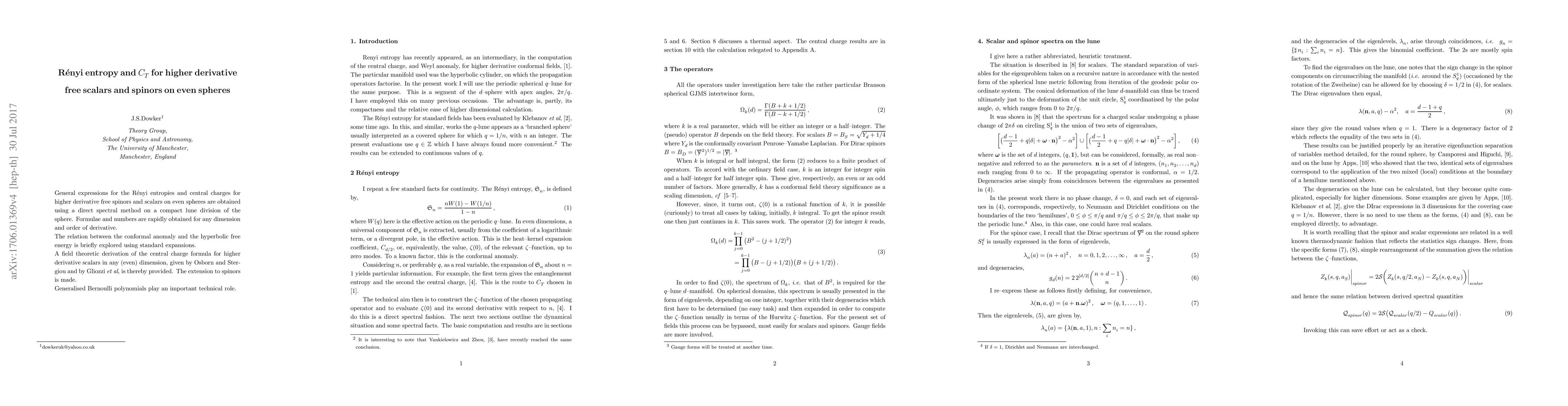 General expressions for the R\'enyi entropies and central charges for higher derivative free spinors and scalars on even spheres are obtained using a direct spectral method on a compact lune division of the sphere. Formulae and numbers are rapidly obtained for any dimension and order of derivative. The relation between the conformal anomaly and the hyperbolic free energy is briefly explored using standard expansions. A field theoretic derivation of the central charge formula for higher derivative scalars in any (even) dimension, given by Osborn and Stergiou and by Gliozzi {\it et al}, is thereby provided. The corresponding extension to spinors is made. Generalised Bernoulli polynomials play an important technical role.