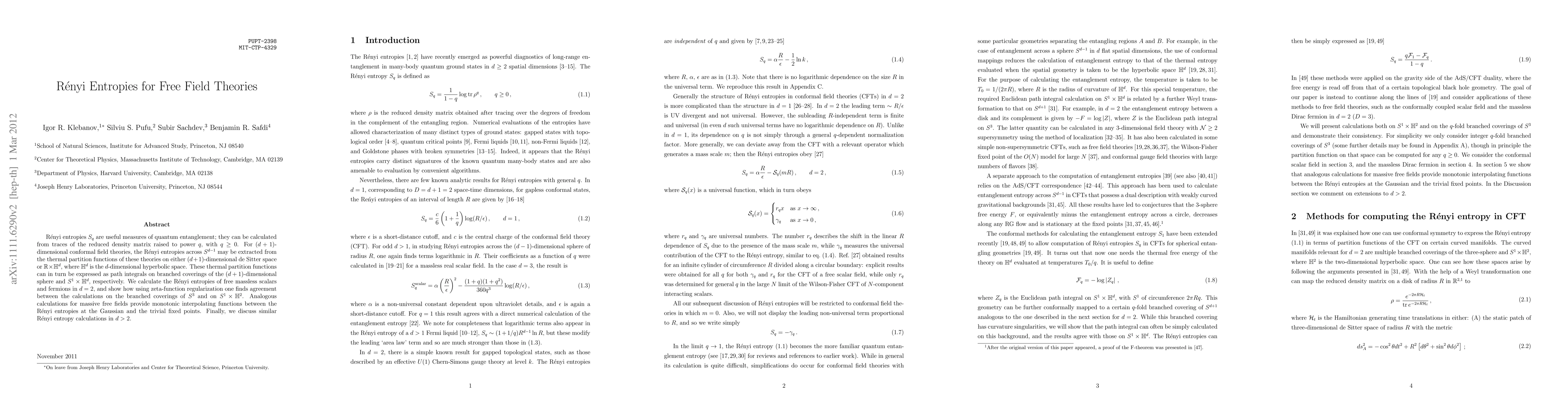 This paper explores Renyi entropies as measures of quantum entanglement in free field theories, calculating them for free massless scalars and fermions in 2D. It demonstrates agreement between calculations on different geometries using zeta-function regularization and discusses interpolating functions for massive fields.