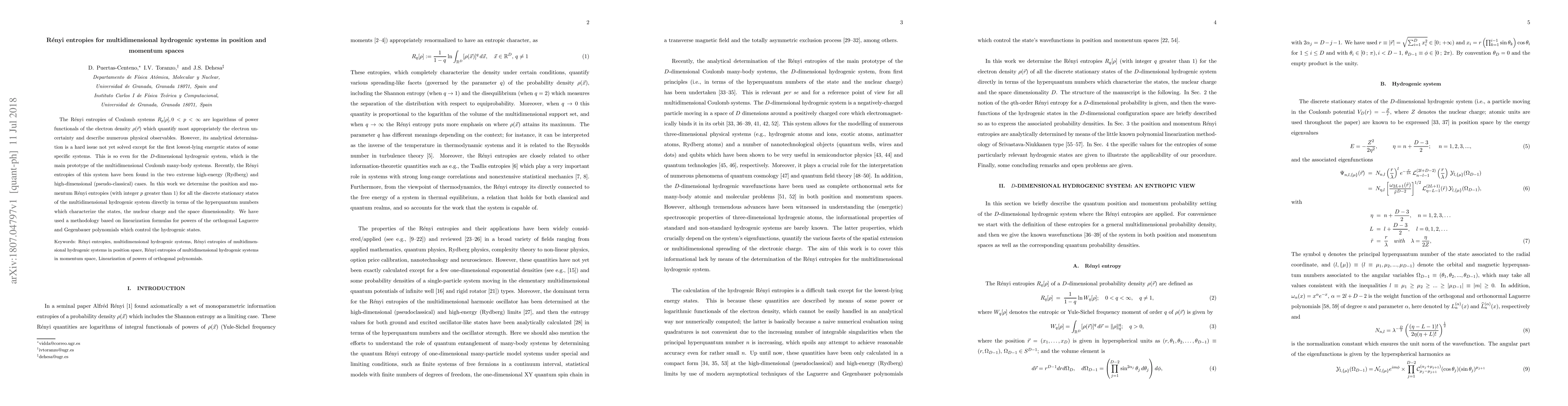 The R\'enyi entropies of Coulomb systems $R_{p}[\rho], 0 < p < \infty$ are logarithms of power functionals of the electron density $\rho(\vec{r})$ which quantify most appropriately the electron uncertainty and describe numerous physical observables. However, its analytical determination is a hard issue not yet solved except for the first lowest-lying energetic states of some specific systems. This is so even for the $D$-dimensional hydrogenic system, which is the main prototype of the multidimensional Coulomb many-body systems. Recently, the R\'enyi entropies of this system have been found in the two extreme high-energy (Rydberg) and high-dimensional (pseudo-classical) cases. In this work we determine the position and momentum R\'enyi entropies (with integer $p$ greater than 1) for all the discrete stationary states of the multidimensional hydrogenic system directly in terms of the hyperquantum numbers which characterize the states, the nuclear charge and the space dimensionality. We have used a methodology based on linearization formulas for powers of the orthogonal Laguerre and Gegenbauer polynomials which control the hydrogenic states.