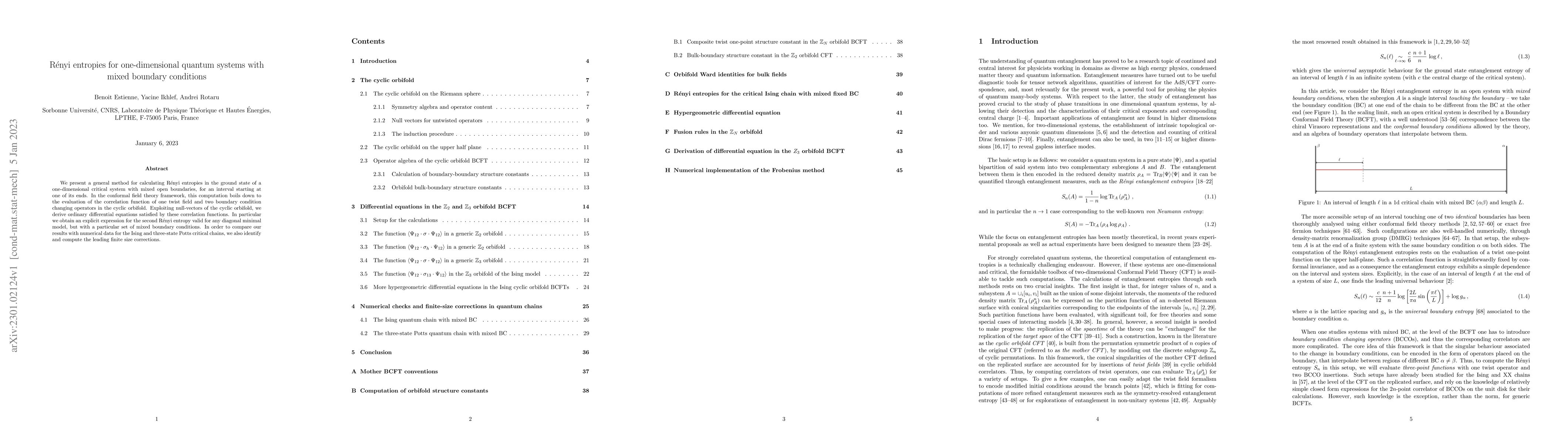 This paper develops a method to calculate Rényi entropies in one-dimensional critical quantum systems with mixed boundary conditions, deriving explicit expressions for the second Rényi entropy and leading finite size corrections, and comparing these results with numerical data for Ising and Potts models.