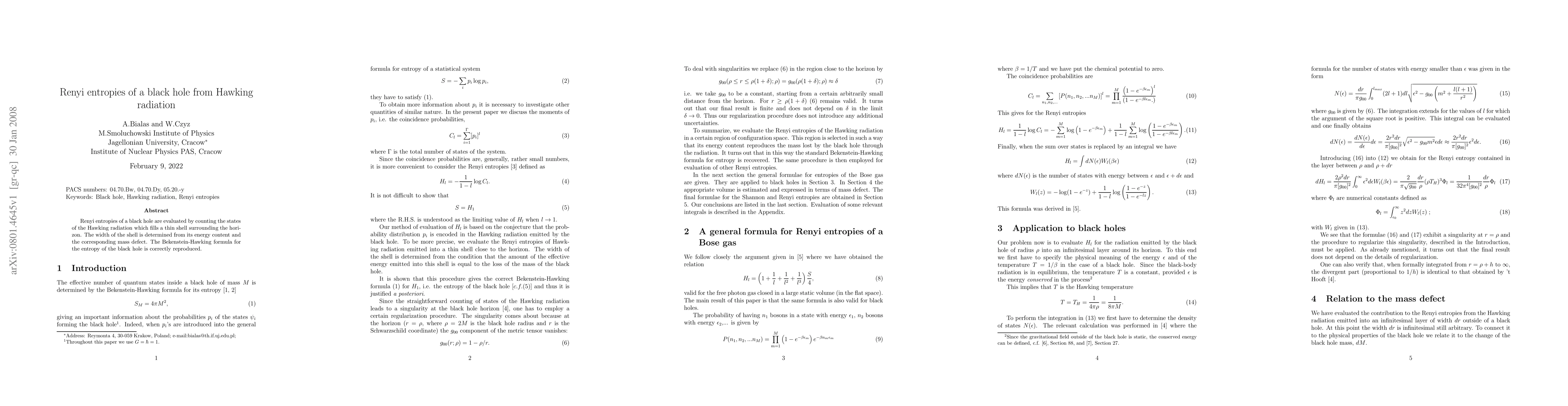 The research evaluates Renyi entropies of a black hole by counting the states of Hawking radiation filling a thin shell around the horizon. The width of the shell is determined by its energy content and mass defect, leading to the Bekenstein-Hawking entropy formula.
