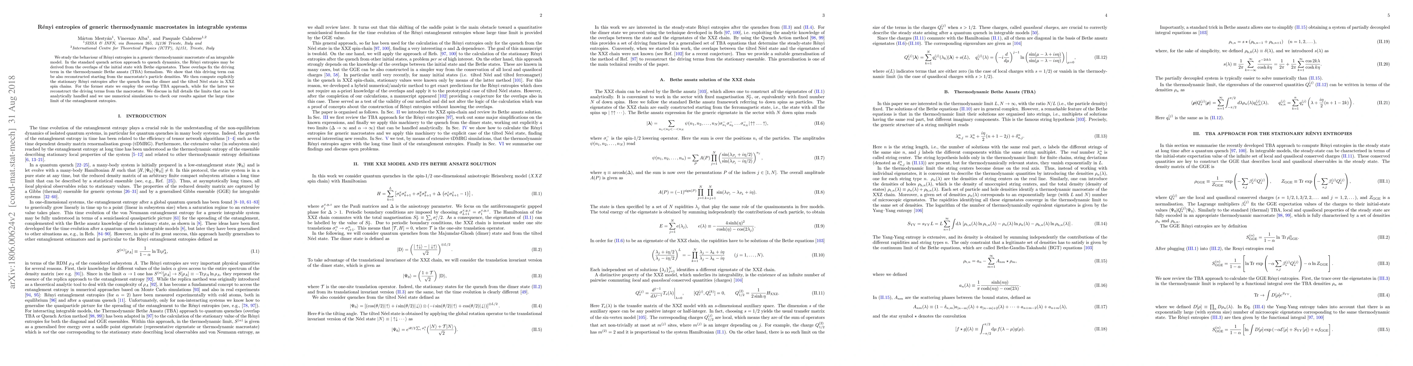 This paper investigates the behavior of R\'enyi entropies in integrable thermodynamic macrostates, showing how the driving term in the thermodynamic Bethe ansatz can be reconstructed from particle densities. It computes stationary R\'enyi entropies post-quench for dimer and tilted N\'eel states in XXZ spin chains, using both analytical and numerical methods to validate results.