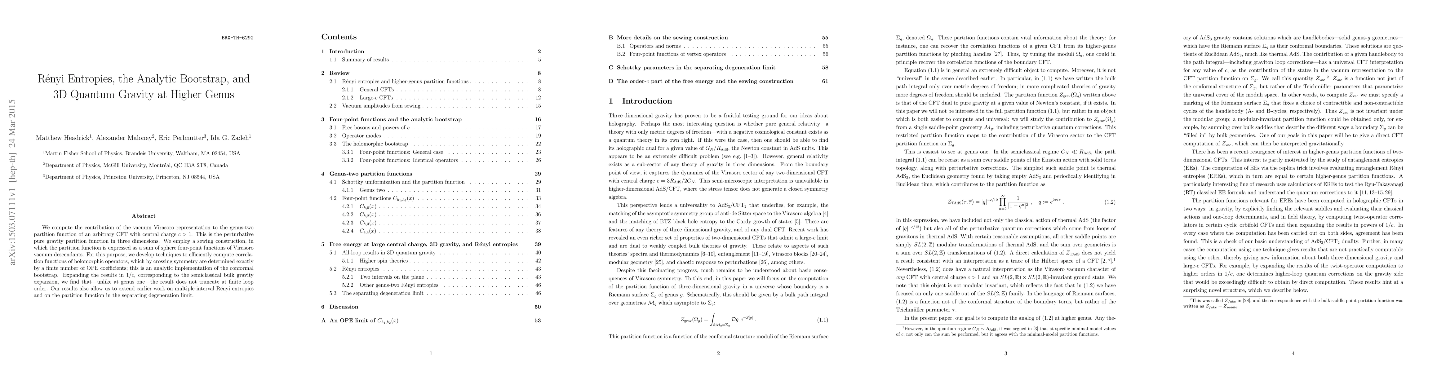 We compute the contribution of the vacuum Virasoro representation to the genus-two partition function of an arbitrary CFT with central charge $c>1$. This is the perturbative pure gravity partition function in three dimensions. We employ a sewing construction, in which the partition function is expressed as a sum of sphere four-point functions of Virasoro vacuum descendants. For this purpose, we develop techniques to efficiently compute correlation functions of holomorphic operators, which by crossing symmetry are determined exactly by a finite number of OPE coefficients; this is an analytic implementation of the conformal bootstrap. Expanding the results in $1/c$, corresponding to the semiclassical bulk gravity expansion, we find that---unlike at genus one---the result does not truncate at finite loop order. Our results also allow us to extend earlier work on multiple-interval Renyi entropies and on the partition function in the separating degeneration limit.