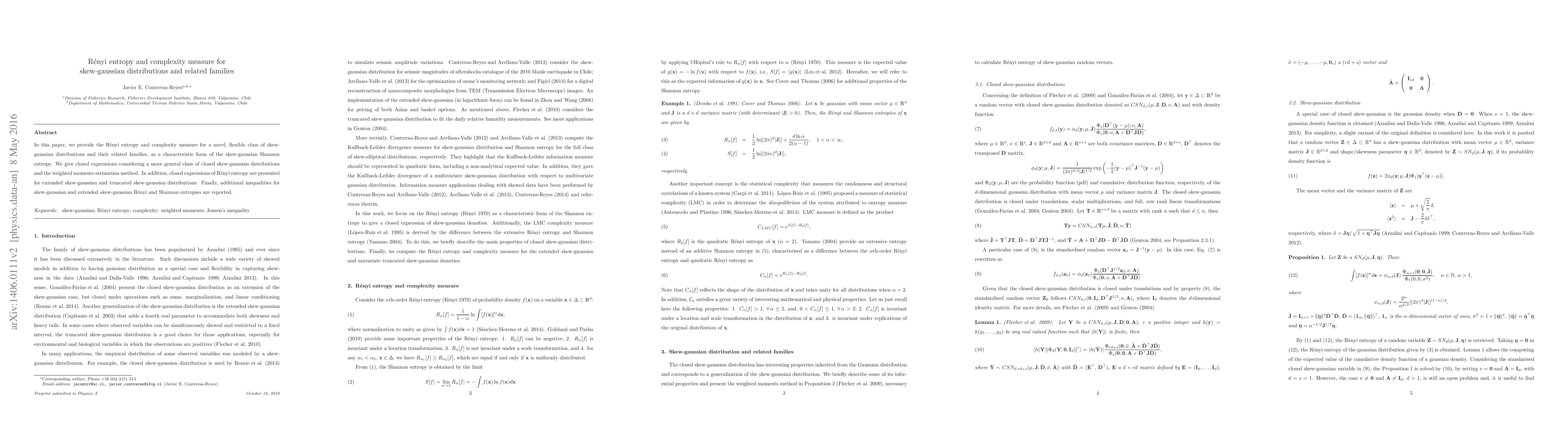 This paper derives R\'enyi entropy and complexity measures for skew-Gaussian distributions and related families, providing closed expressions for extended and truncated variants, and reports inequalities for these entropy measures.